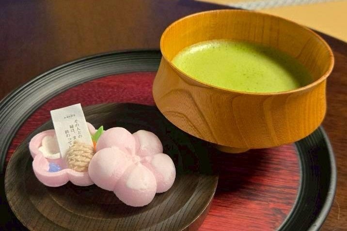 抹茶は、伝統工芸・山中漆器の名匠「我戸幹男商店(がとみきおしょうてん)」(石川県加賀市山中温泉上原町ヨ58-1)の器でご提供いたします。天然木のぬくもりと艶やかな漆の風合いが手に心地よく、口に運ぶたびにやわらかな香りがふわりと広がります。