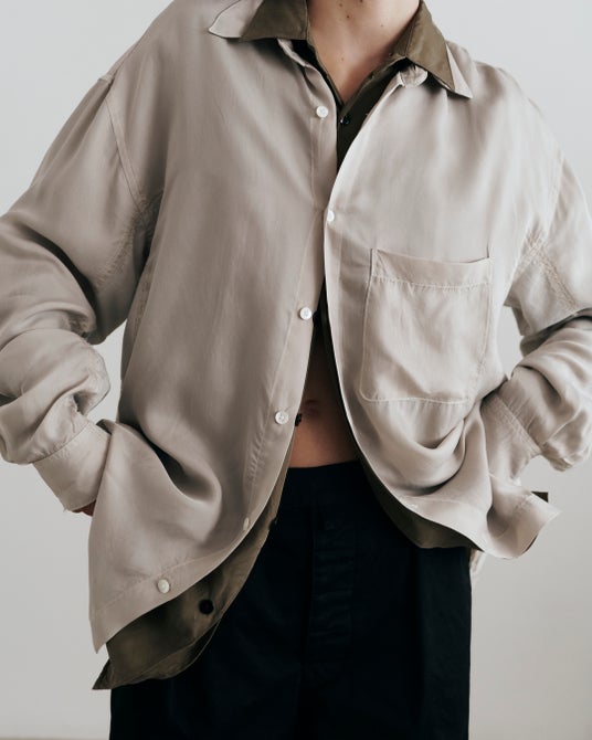 CONNECTED SHIRT税込価格:¥45,100-キュプラのシャツにコットンシルクボイルを異素材をドッキングし、製品で染料顔料加工で同色で染めています。