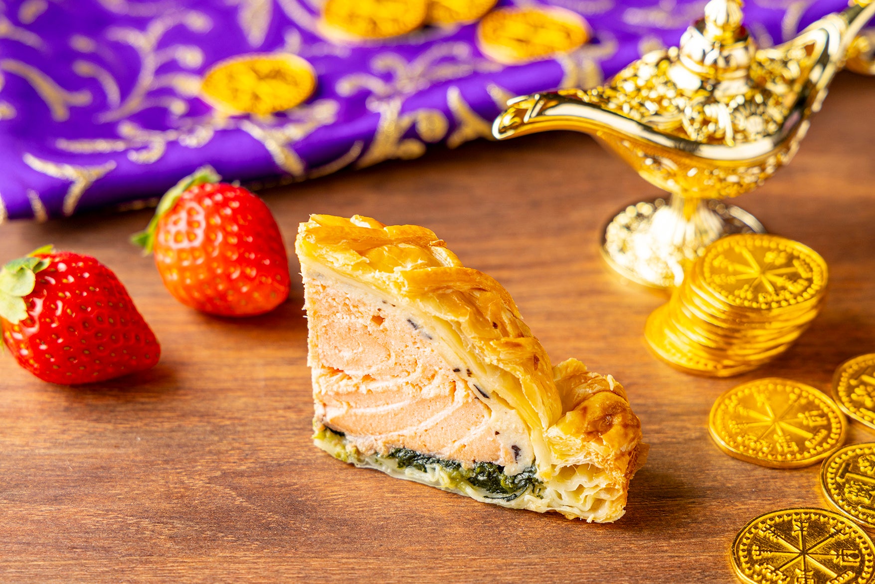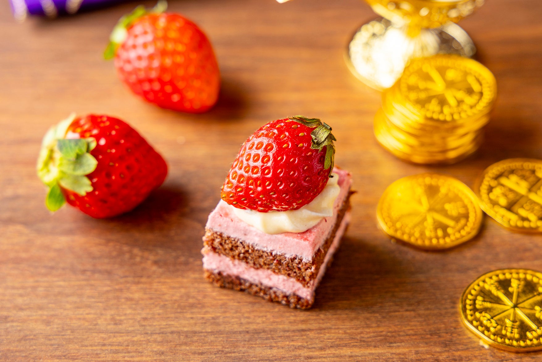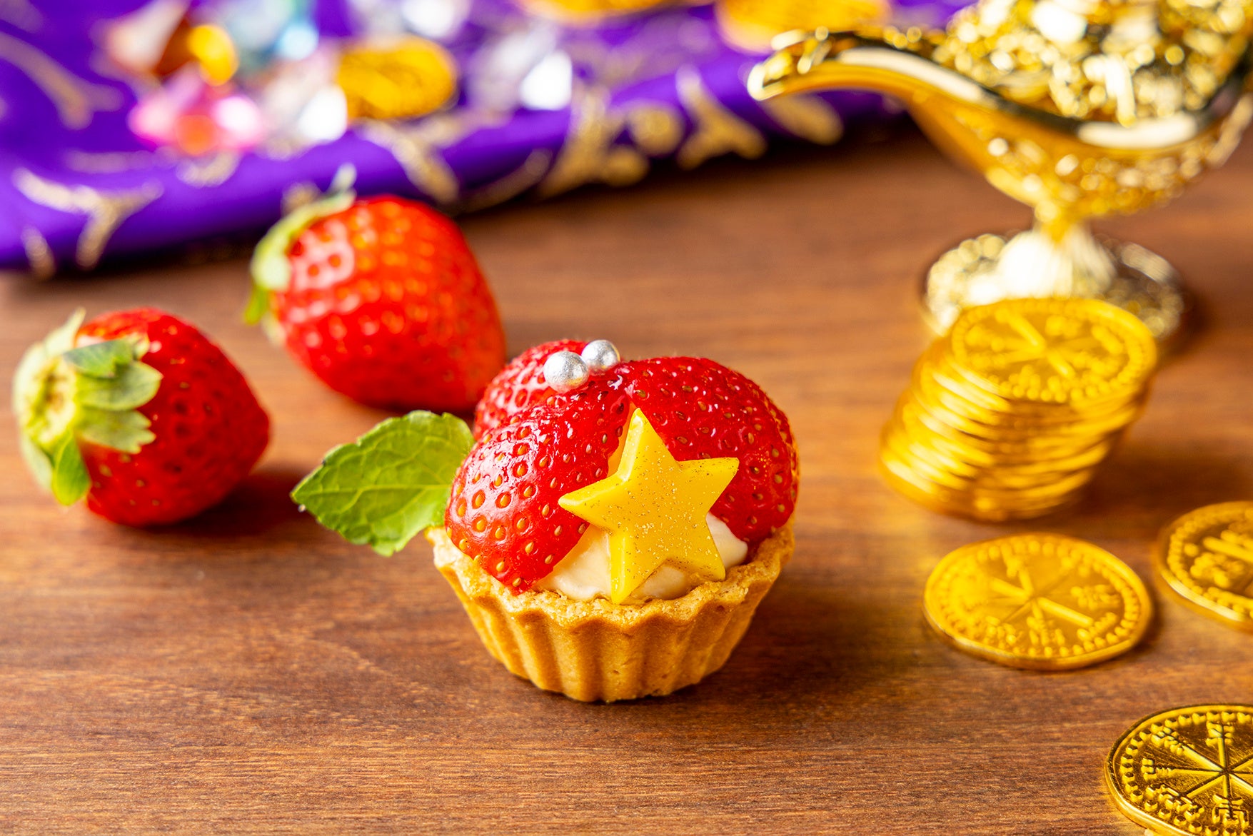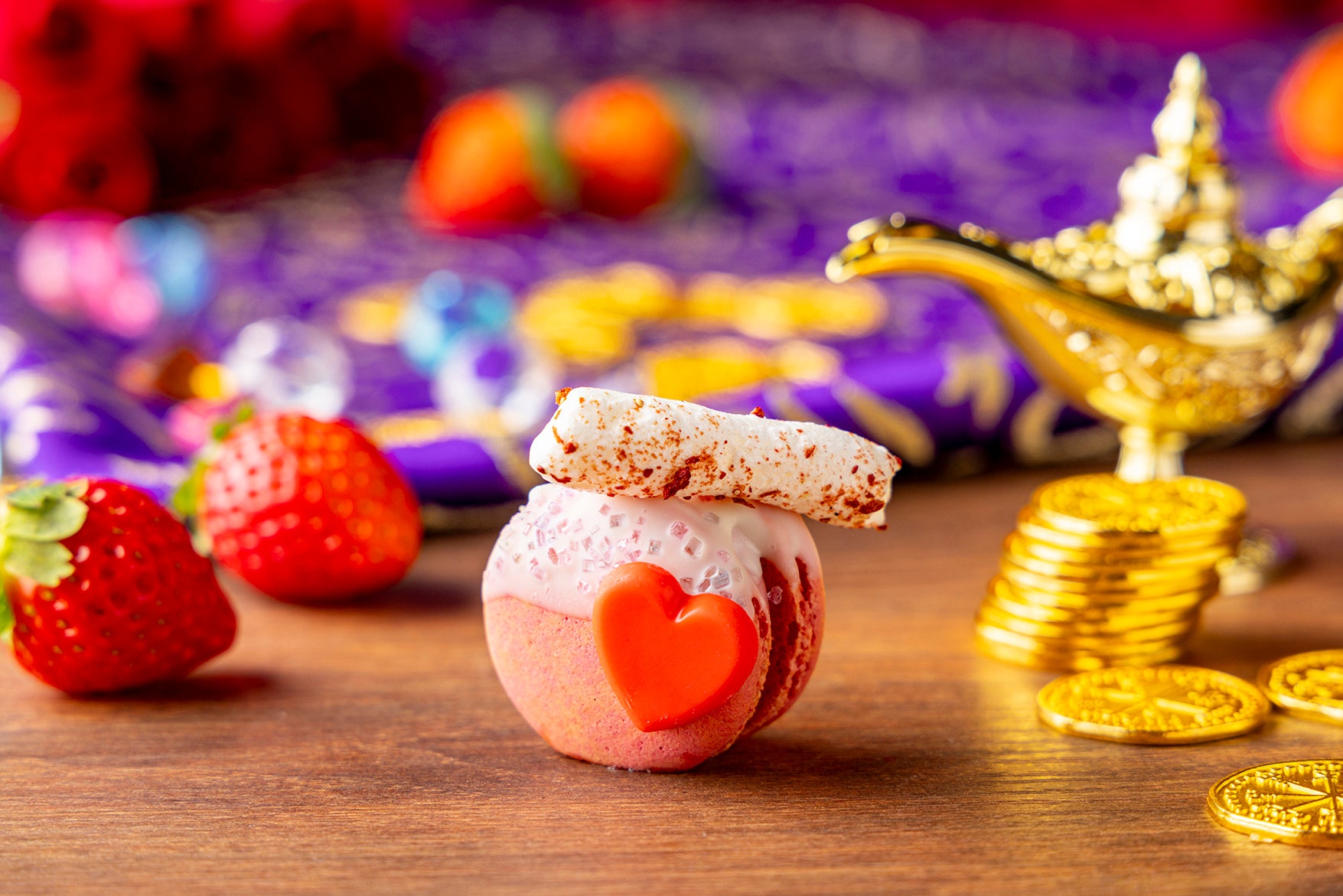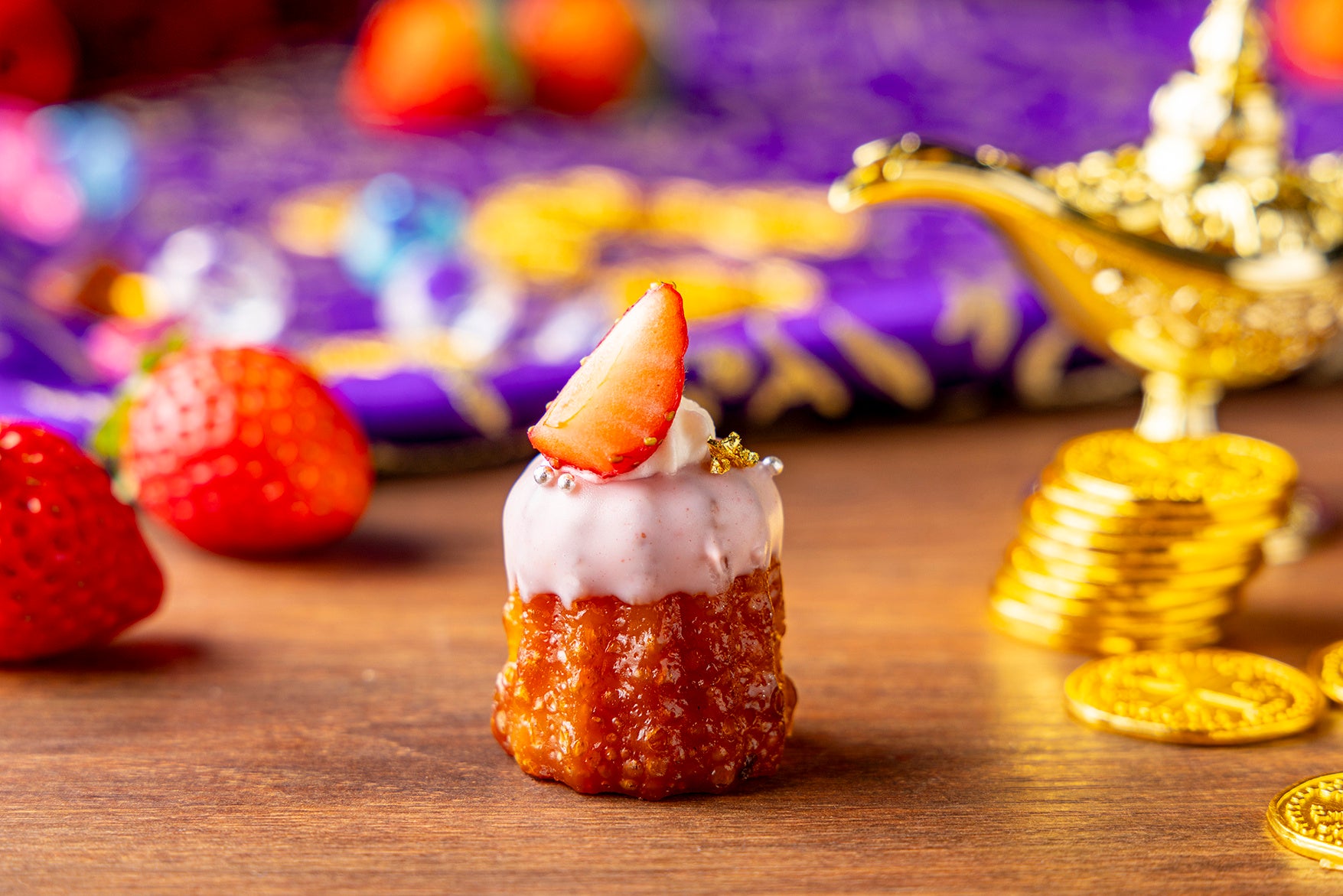 小ぶりなカヌレを甘酸っぱいいちごチョコでコーティングし、フレッシュないちごと小粒のアラザン、金箔をトッピング。宝石のように輝く華やかな一品で、アラビアンナイトの幻想的な世界観を感じさせます。