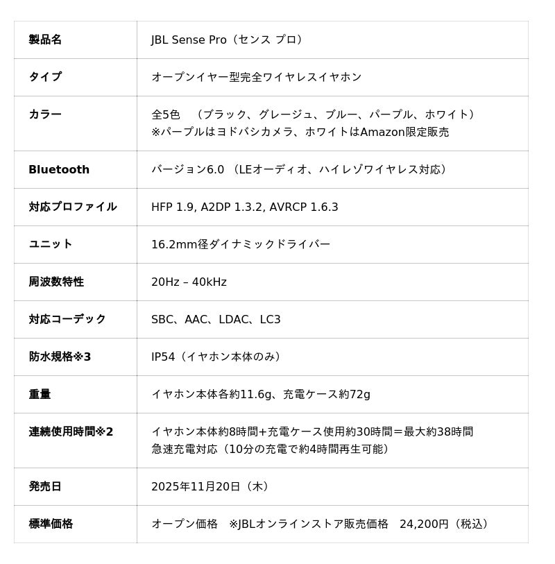 ハーマンインターナショナル株式会社(本社:東京都千代田区、代表取締役:桑原拓磨)は、アメリカ カリフォルニア発祥の世界最大級のオーディオブランドであり、日本においてワイヤレススピーカー7年連続販売台数No.1※1に輝く「JBL」より、クラウドファンディングサイト「GREEN FUNDING」にて目標達成率7,200%超えを記録した、オープンイヤー型完全ワイヤレスイヤホンのフラッグシップモデル「JBL Sense Pro(センス プロ)」の一般販売を11月20日(木)より開始いたします。
