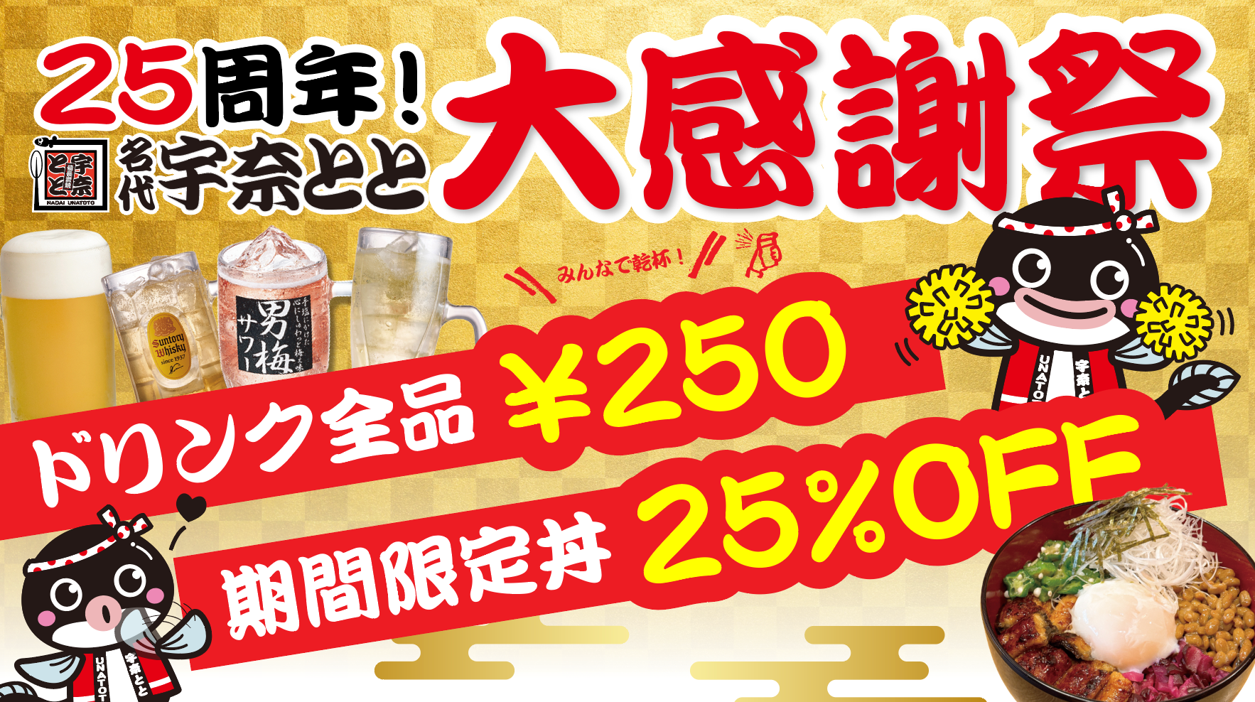 25周年の「25」に感謝を込めて、全国の宇奈ととでドリンク全品250円(税込)を実施します。