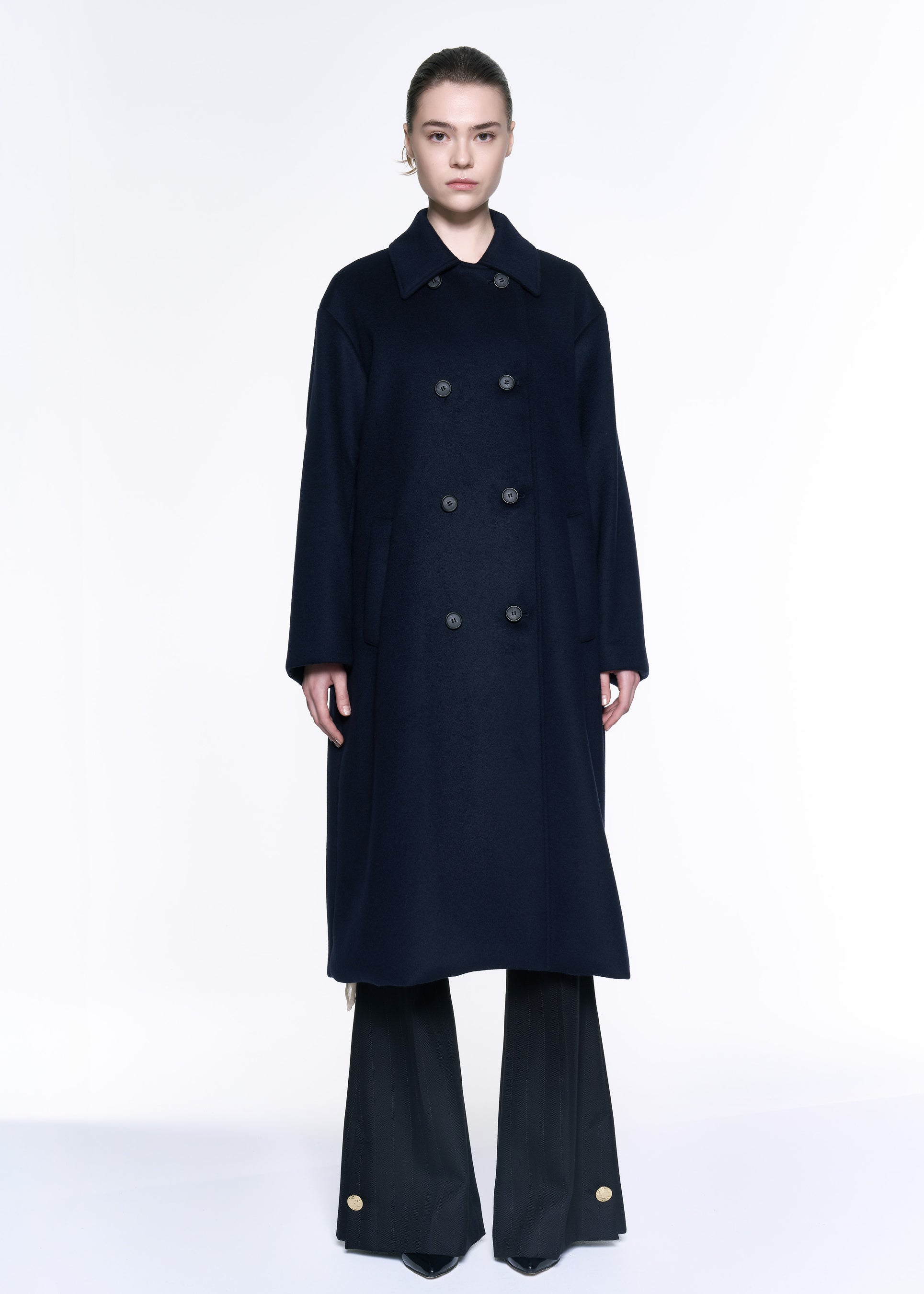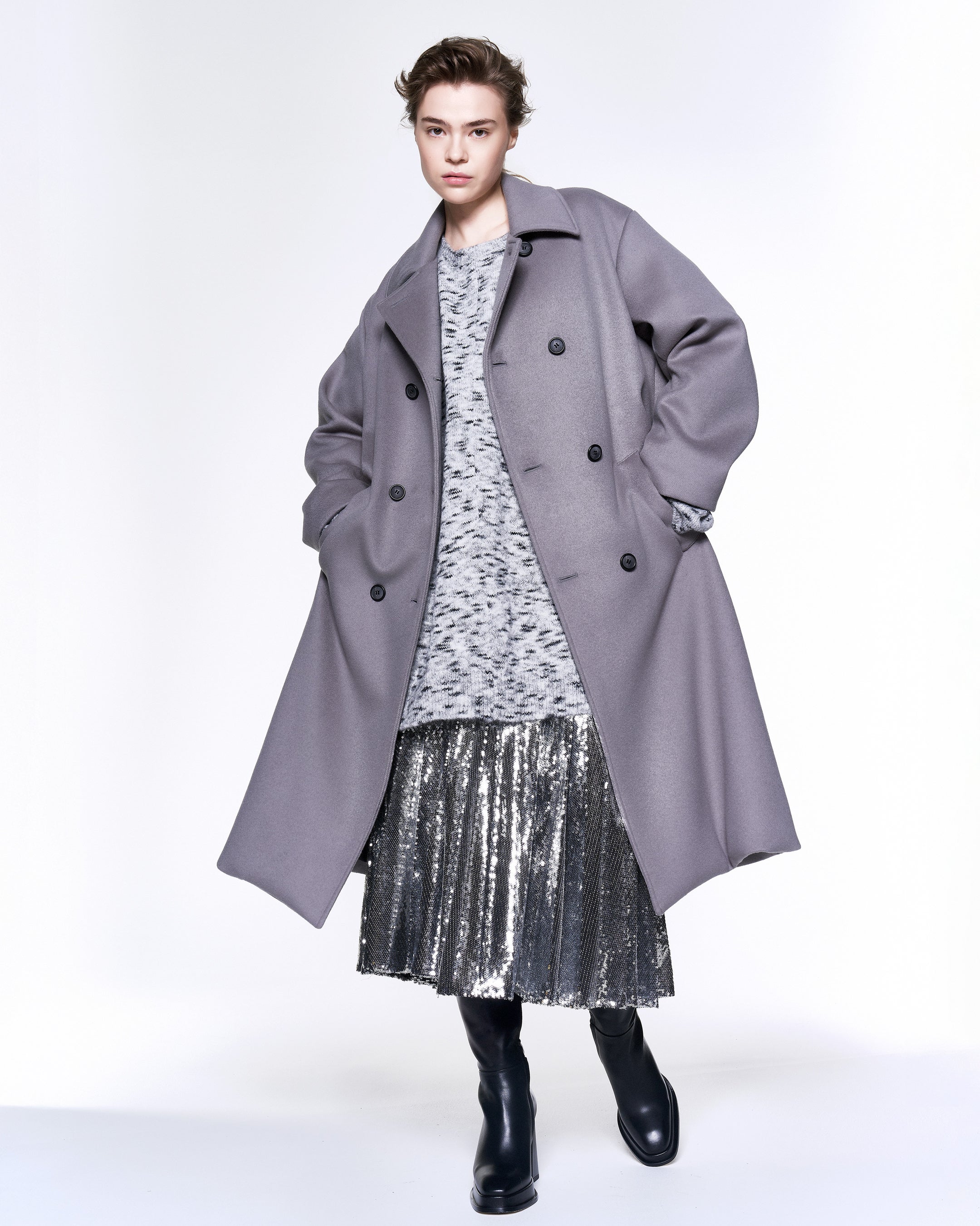 ロングコートはクラシックなダブルブレストをベースに、大きすぎない襟元が上品な印象を保ちながら、顔まわりをすっきりと見せます。羽織るだけで背筋が伸びるような端正な佇まいと、程よく肩の力が抜けたシルエットのバランスが魅力です。