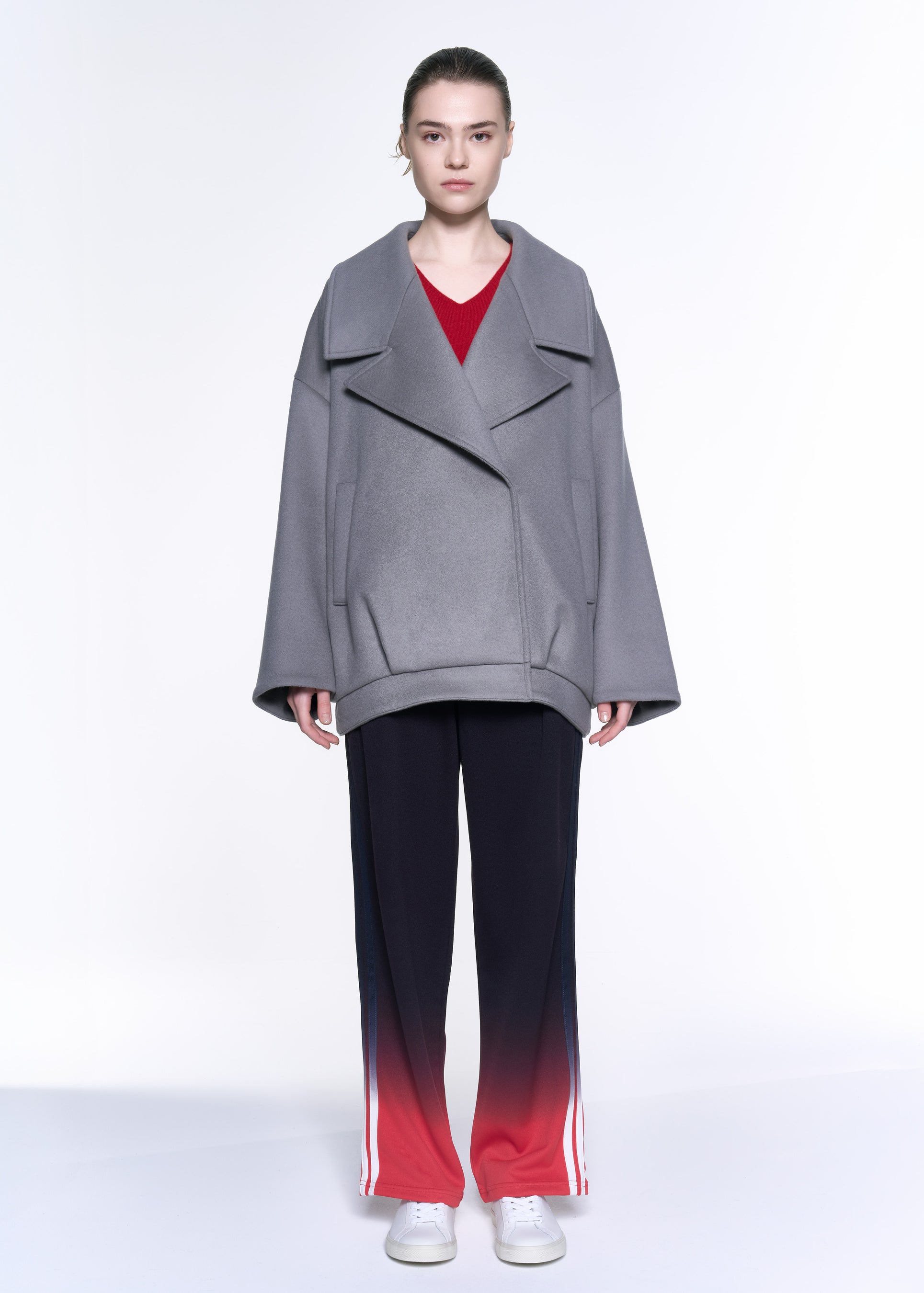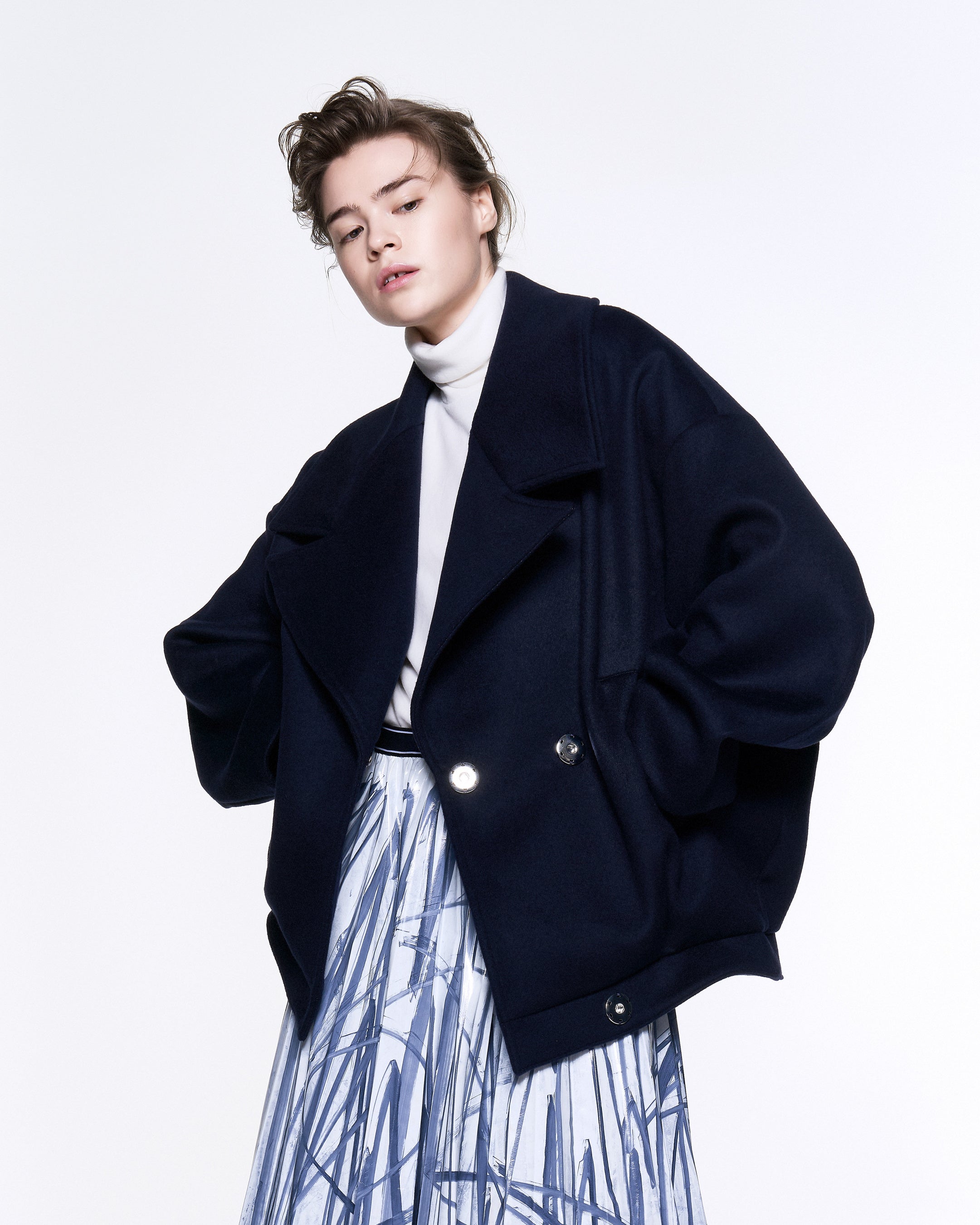 一方、ショートブルゾンは印象的なビッグカラーとコクーンシルエットが特徴。裾に入れたタックが柔らかな丸みを生み、構築的でありながら女性らしいフォルムを演出します。パンツにもスカートにも合わせやすく、冬の装いを軽やかにアップデートしてくれます。