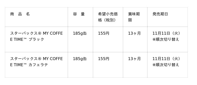 スターバックス・コーポレーション(本社:米国 シアトル、CEO:ブライアン・ニコル)と、サントリー食品インターナショナル株式会社(本社:東京都、社長:小野真紀子)は、ご好評いただいているショート缶コーヒーシリーズ「スターバックス(R) MY COFFEE TIME(TM) ブラック」と「同 カフェラテ」をリニューアルし、11月11日(火)から順次切り替え発売します。
