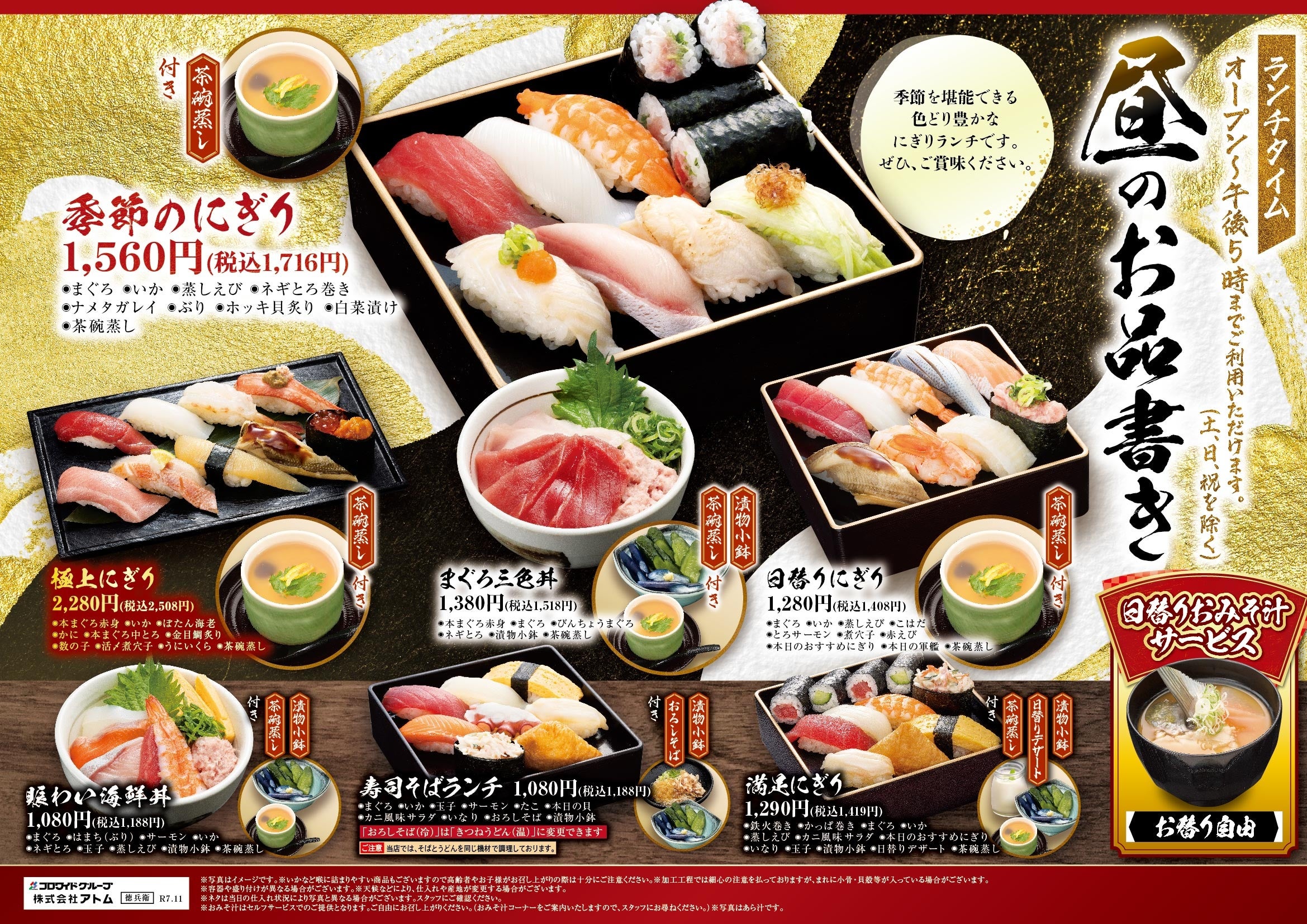 平日限定で午後5時まで販売(一部店舗で土曜日は午後4時まで販売)しているランチメニューは新鮮な旬のネタをお得に味わえます!2025年11月11日(火)より冬限定のネタを使用した「季節のにぎり」も販売開始します。さらに、ランチタイムは日替りおみそ汁をご用意しており、セルフサービスでアツアツを何杯でも無料でお楽しみいただけます。職人が握る本格寿司をお手頃価格でご堪能いただけるランチメニューは、初めてにぎりの徳兵衛や海鮮アトムにご来店いただく方にも大変おすすめです。