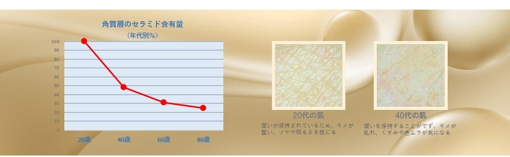 トラブルを知らない健康的で潤いのある肌のカギは、角質層の細胞間脂質に存在するセラミドの量。40代で一気に減少し20代の約半分にまでなってしまうセラミドですが、実はスキンケアで補うことができ、角質層に浸透し肌のセラミドとして働いてくれる成分です。