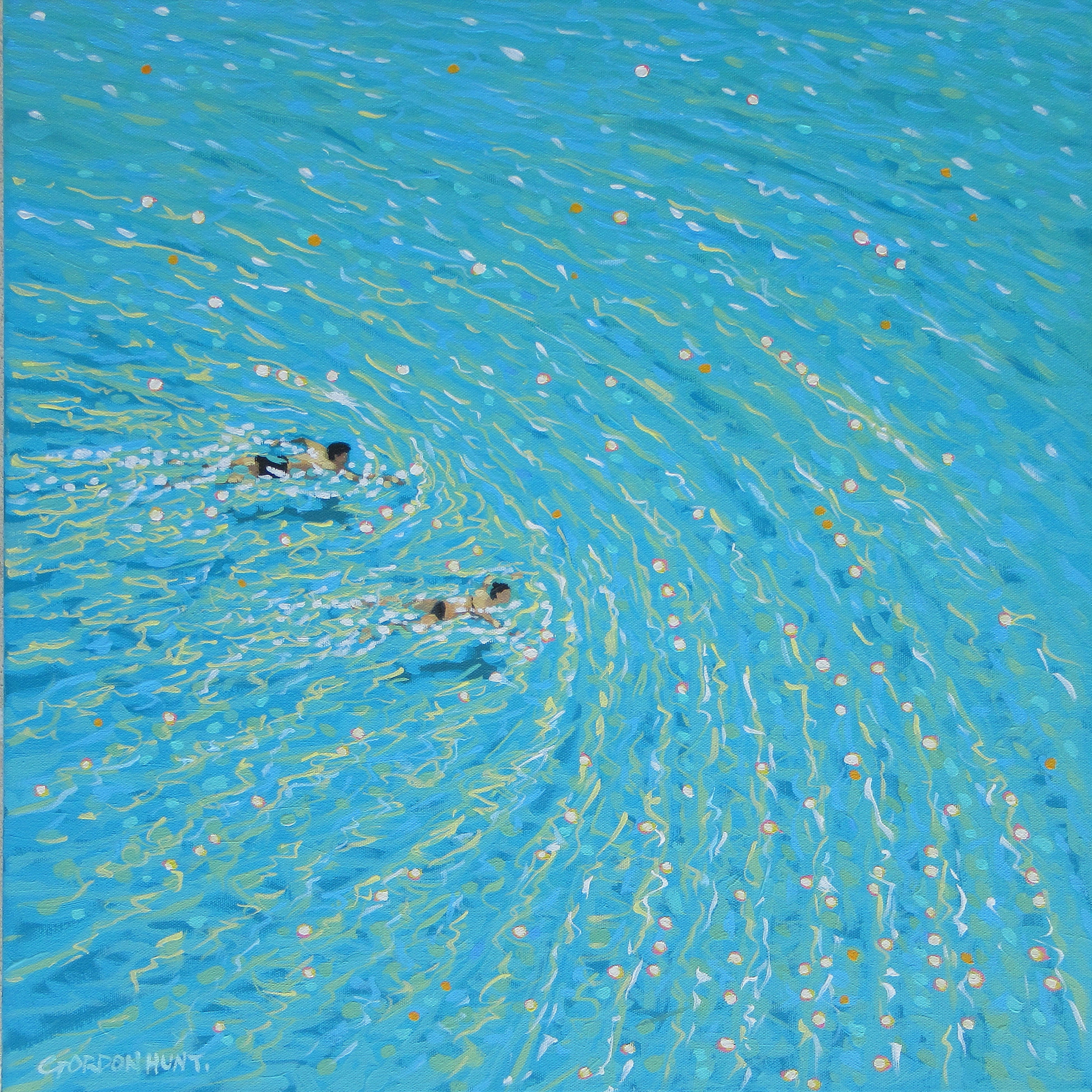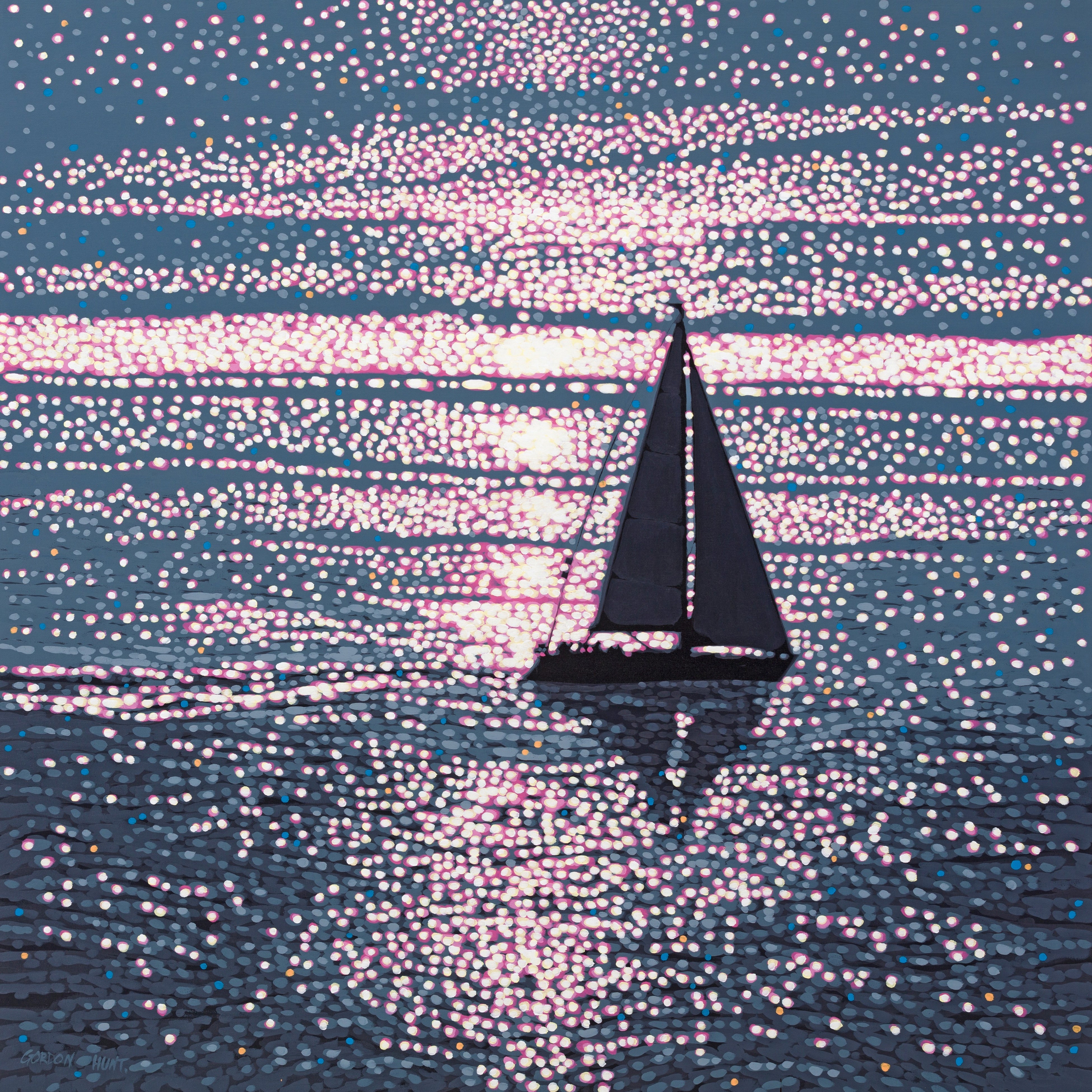 Gordon Hunt氏の作品は、「光」を中心テーマとして、水面に反射する光の揺らぎ、空と海が織りなす微妙な色彩変化を独自の技法で捉えています。印象派的な筆致とミニマリスティックな構図を融合させ、シンプルながら奥行きのある表現を実現。観る者に静謐な感動と、海辺の穏やかな時間を追体験させる力を持っています。