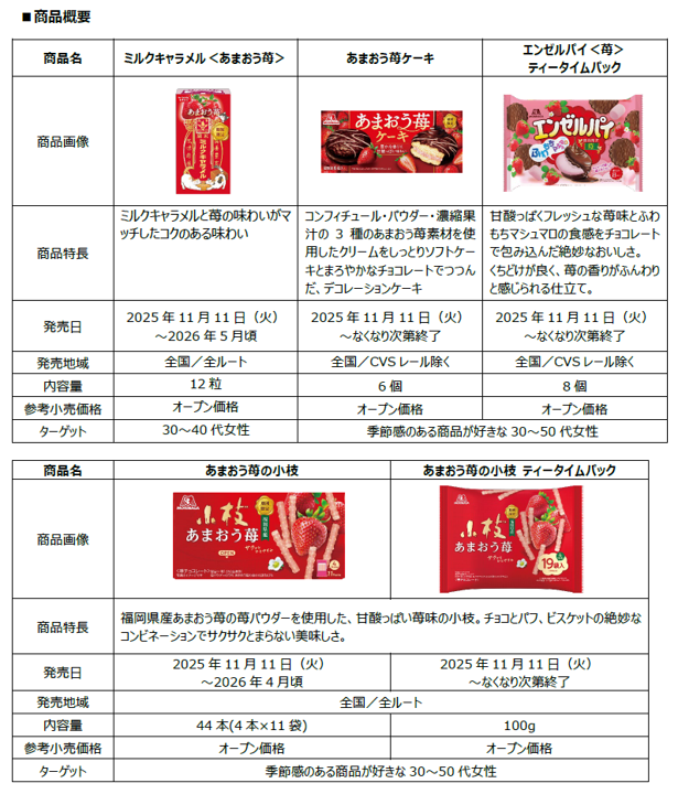 苺の季節を先取り! “ふわもち”エンゼルパイ、“サクサク”小枝、ミルクキャラメルなど人気商品から苺フレーバー全5品登場11月11日(火)より期間限定発売