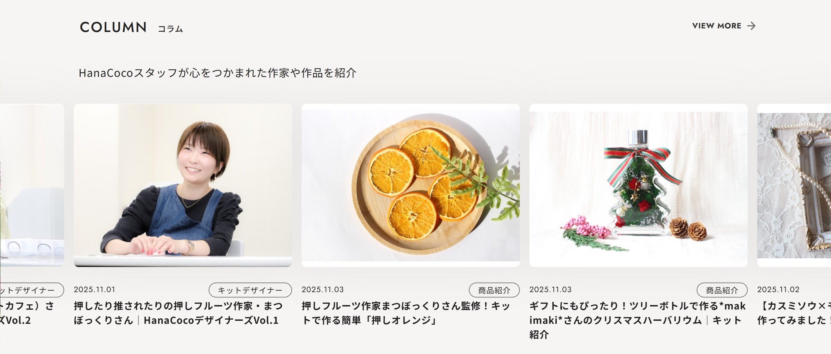 花やクラフトにまつわるコラムや、クリエイターのインタビューを続々掲載。読みものを通じて「HanaCoco」の世界観を楽しむことができます。