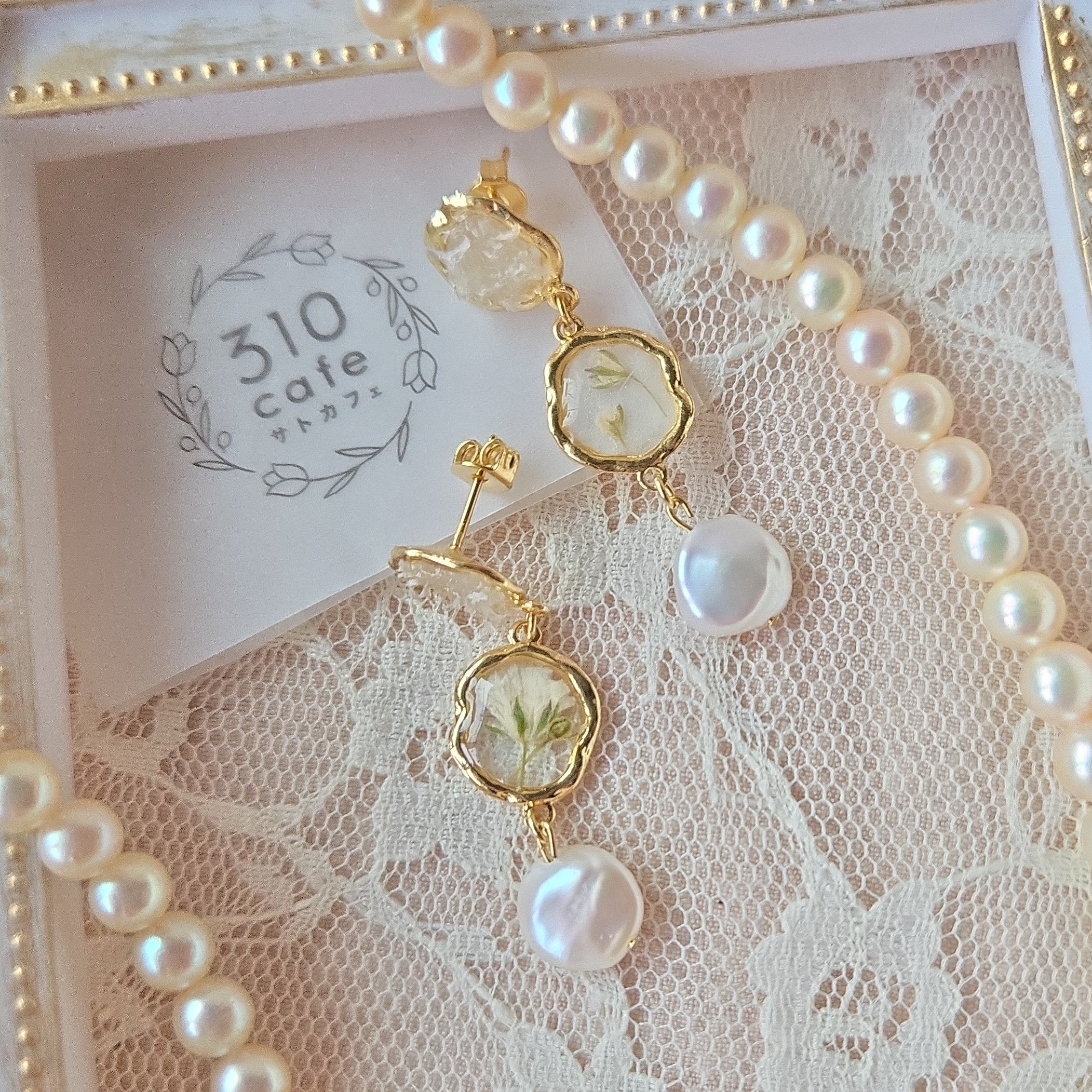 カスミソウやモス、淡水パールを組み合わせて作る、 表情豊かな3連デザインの耳飾りキットです。