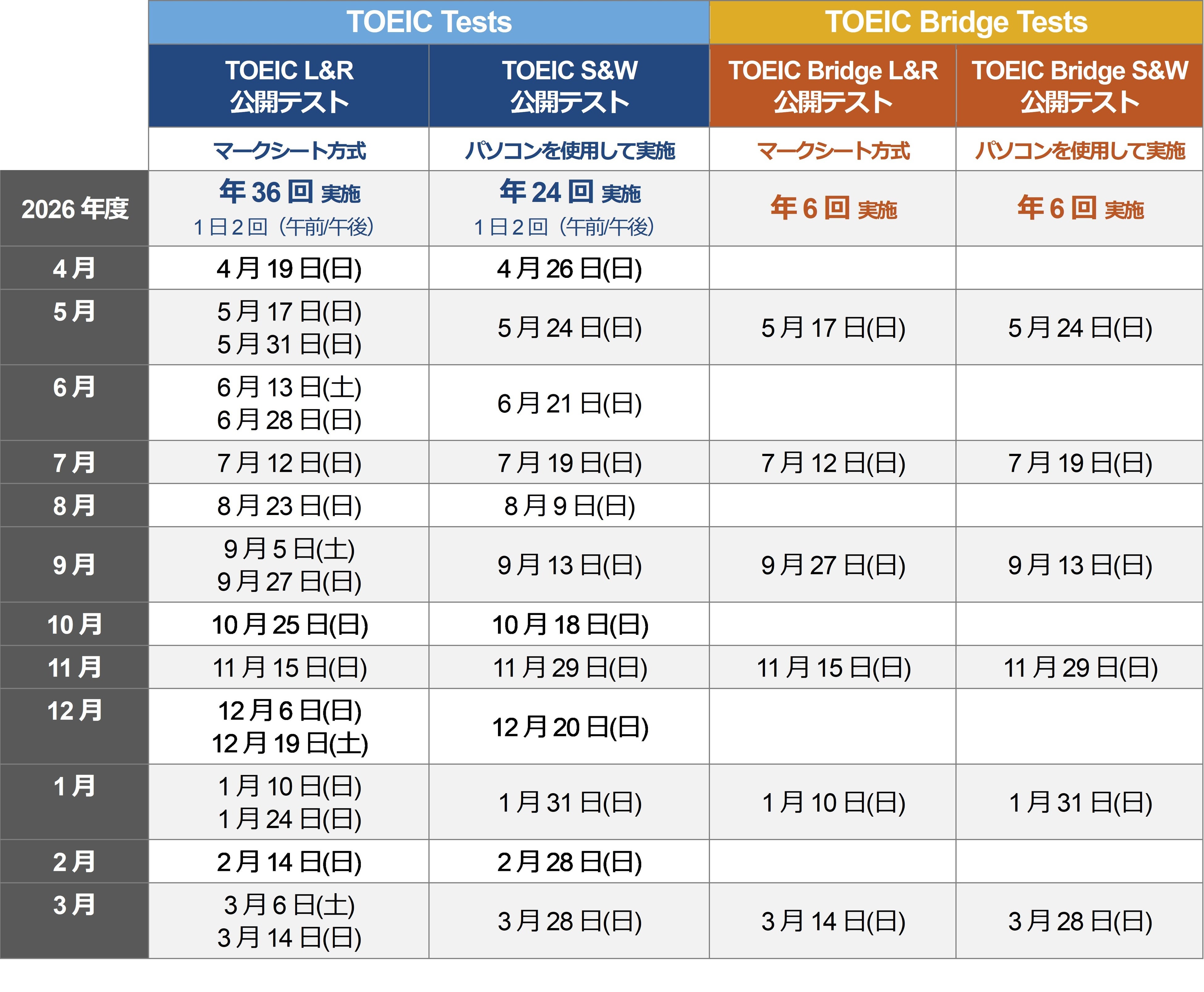 2026年度のTOEIC(R) Program 公開テスト日程を発表