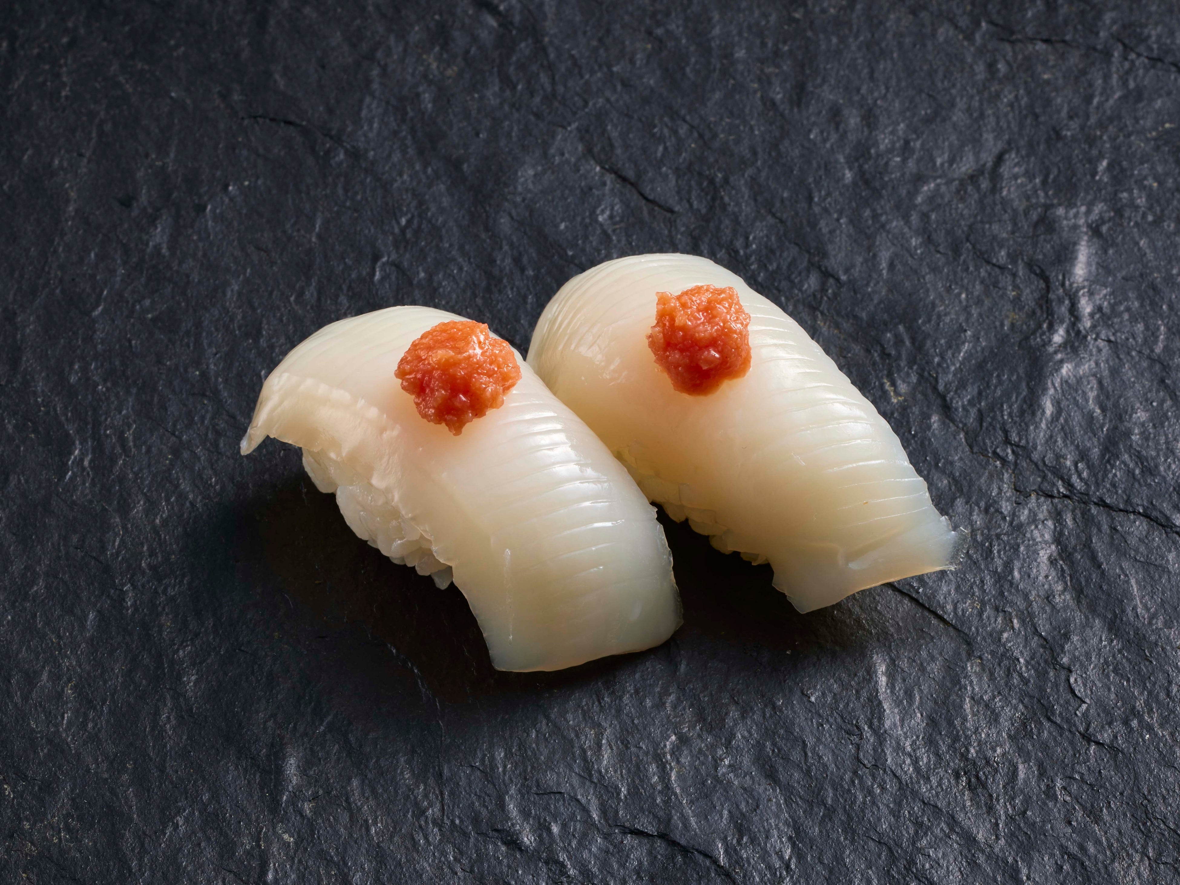 やわらかないかに、博多明太子を贅沢にトッピング。旨みが重なり合う至福の握りです。