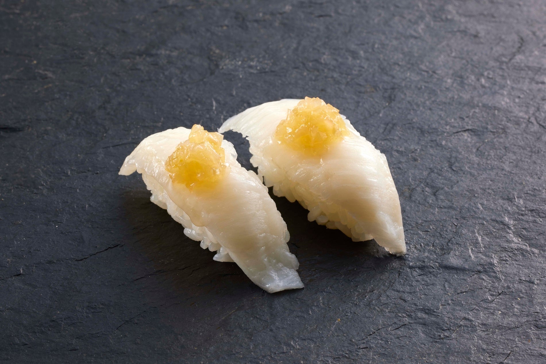 やさしい甘みの玉子焼きに、博多明太子を添えた一品。玉子のまろやかさと明太子の旨みが調和した、幅広い世代にお楽しみいただける握りです。