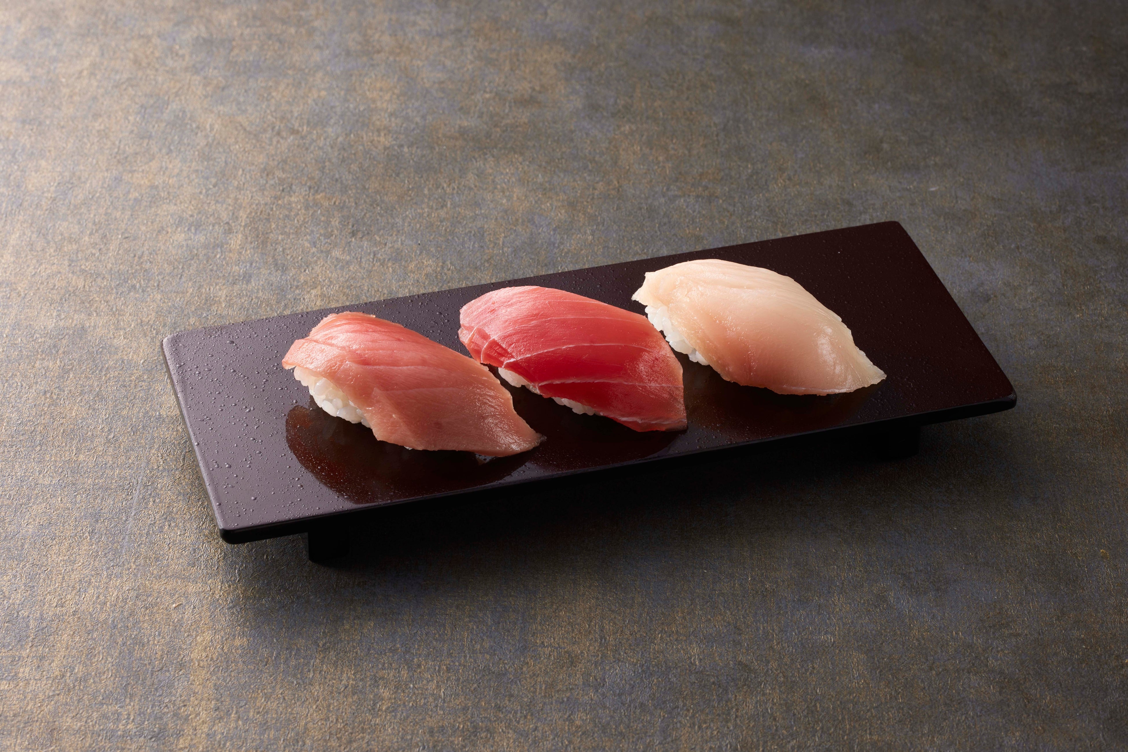 「鮪づくし三貫盛り(中とろ、赤身、とろびんちょう)」単品539円