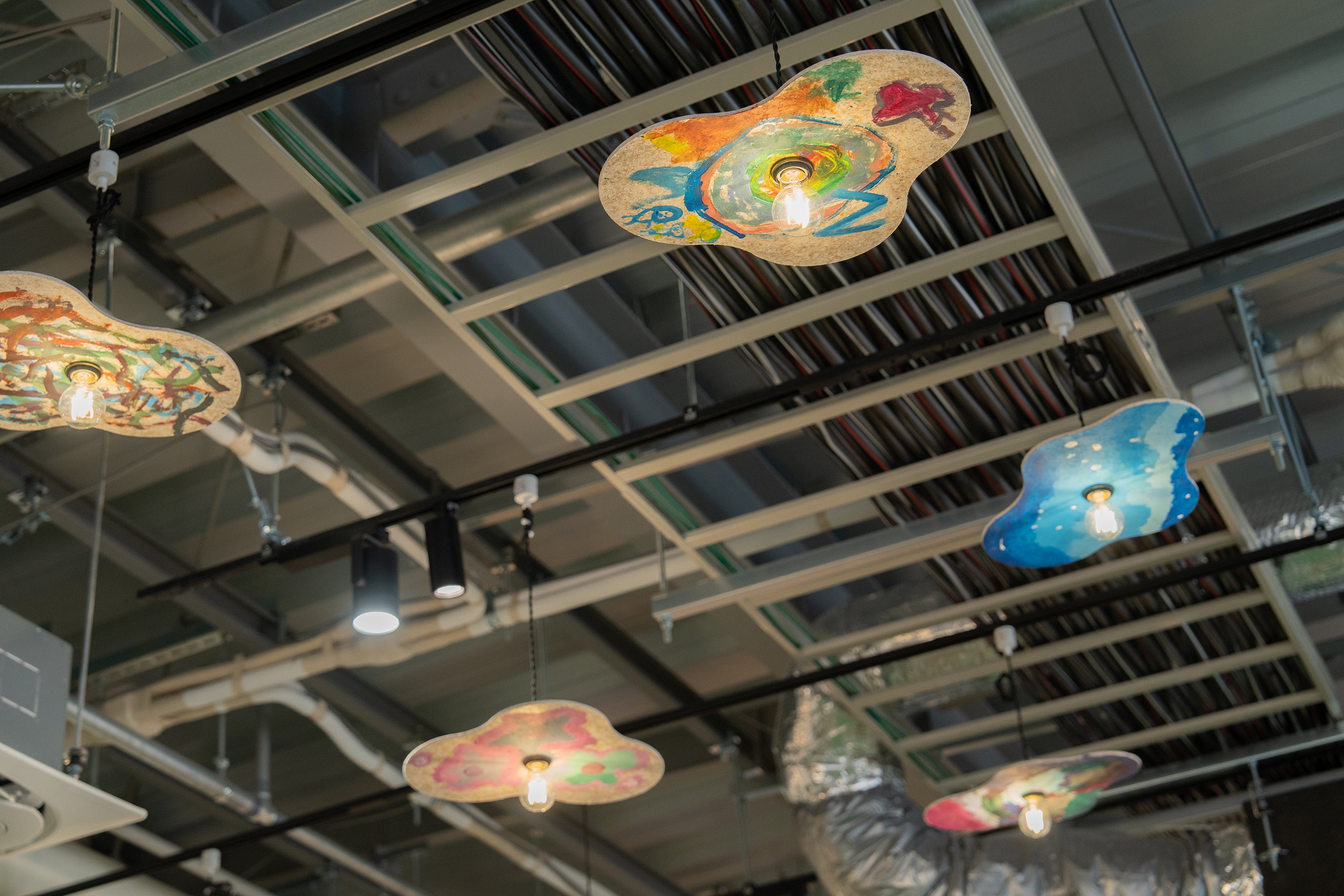 「遊んでい館?」をやさしく照らし続けた、子どもたちとともに廃材からつくり上げたペンダント照明。この照明は、制作に参加した50人の子どもたちの手元へお届けします。