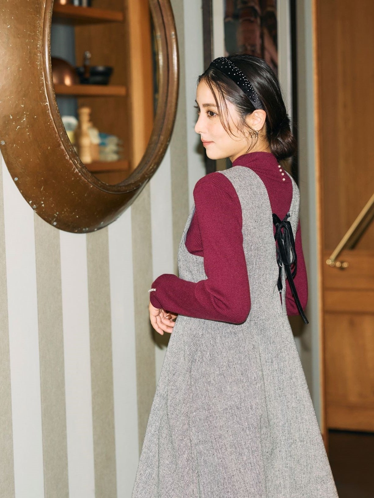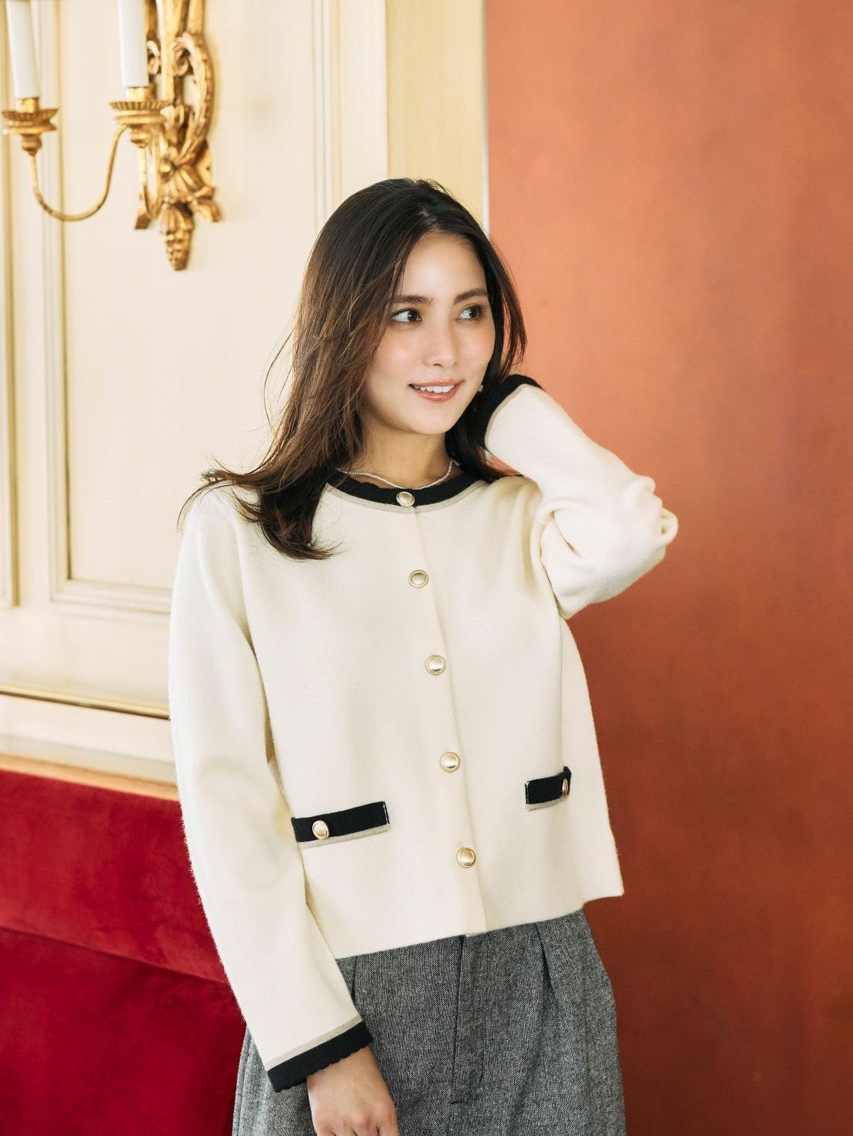 クチュールブローチがおすすめする冬の新作アイテムをラインアップした今回の特集ページでは、エレガントなシルエットのチェスターコートや、肩部分の大きなリボンが特徴のニット、大人可愛いツィード素材のワンピースやパンツなど、フレンチシックな冬の最新コレクションを石川恋さんが素敵に着こなしています。