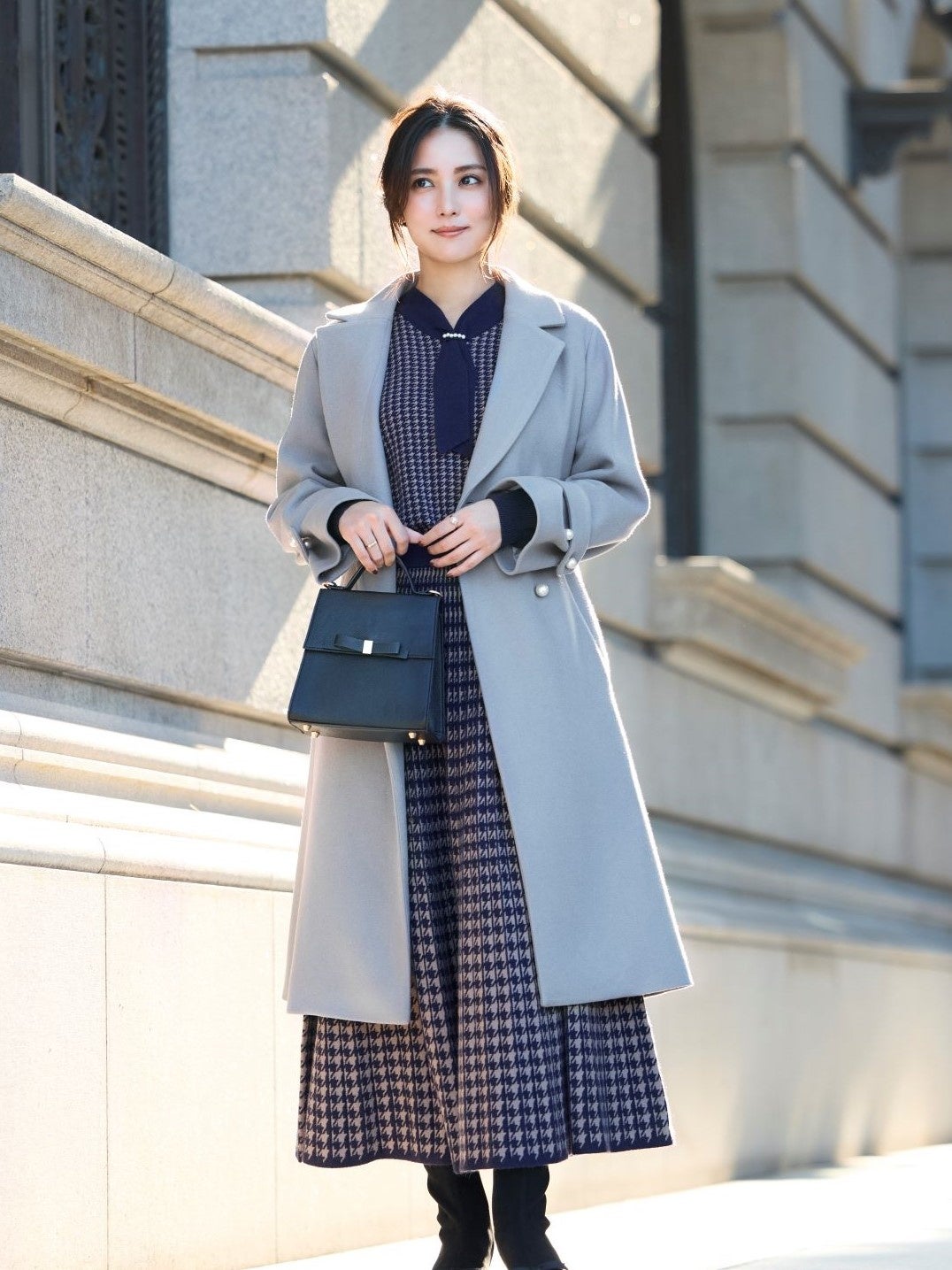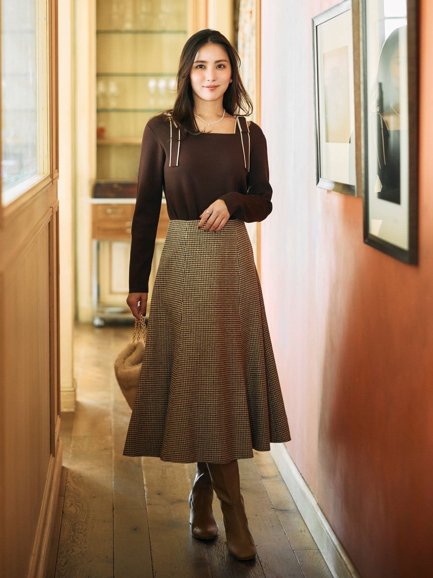 Coat ¥16,990 Knit ¥5,990 Skirt ¥6,990 Boots ¥9,900 Bag ¥7,990