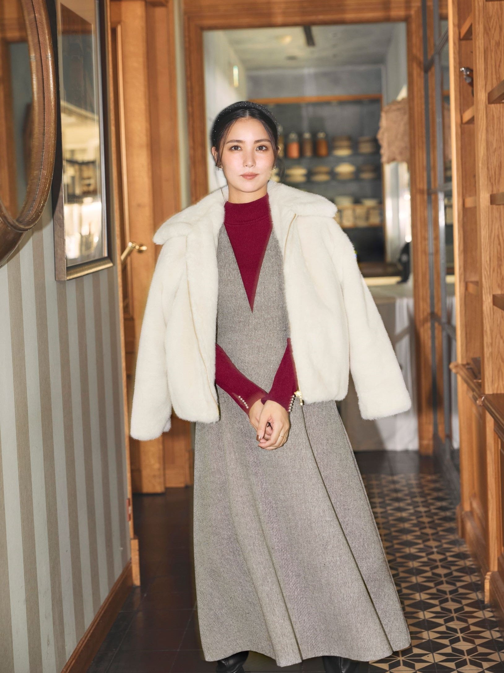 Outer ¥16,500 Knit ¥4,990 One-piece ¥7,990 Hair Accessory ¥3,500 Earring ¥2,500