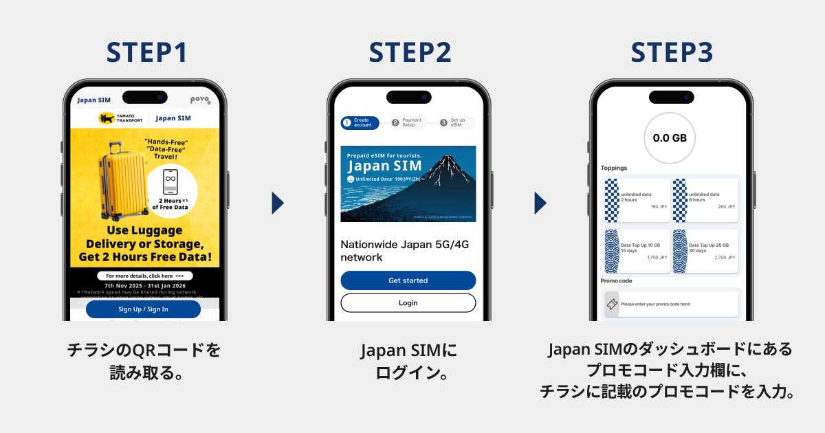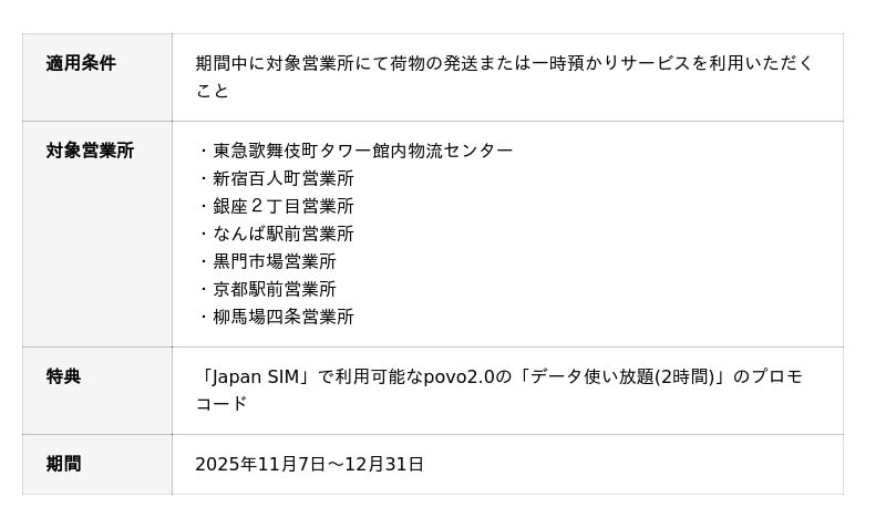KDDIは、2025年11月7日から、ヤマト運輸株式会社(以下、ヤマト運輸)の所定の営業所において荷物の発送や一時預かりサービスをご利用いただくと、訪日外国人向けデータ専用eSIM「Japan SIM」で利用可能なpovo2.0の「データ使い放題(2時間) (注)」のプロモコードがもらえるキャンペーンを開始します。プロモコードは、ヤマト運輸営業所に設置された専用チラシにてご確認いただけます。