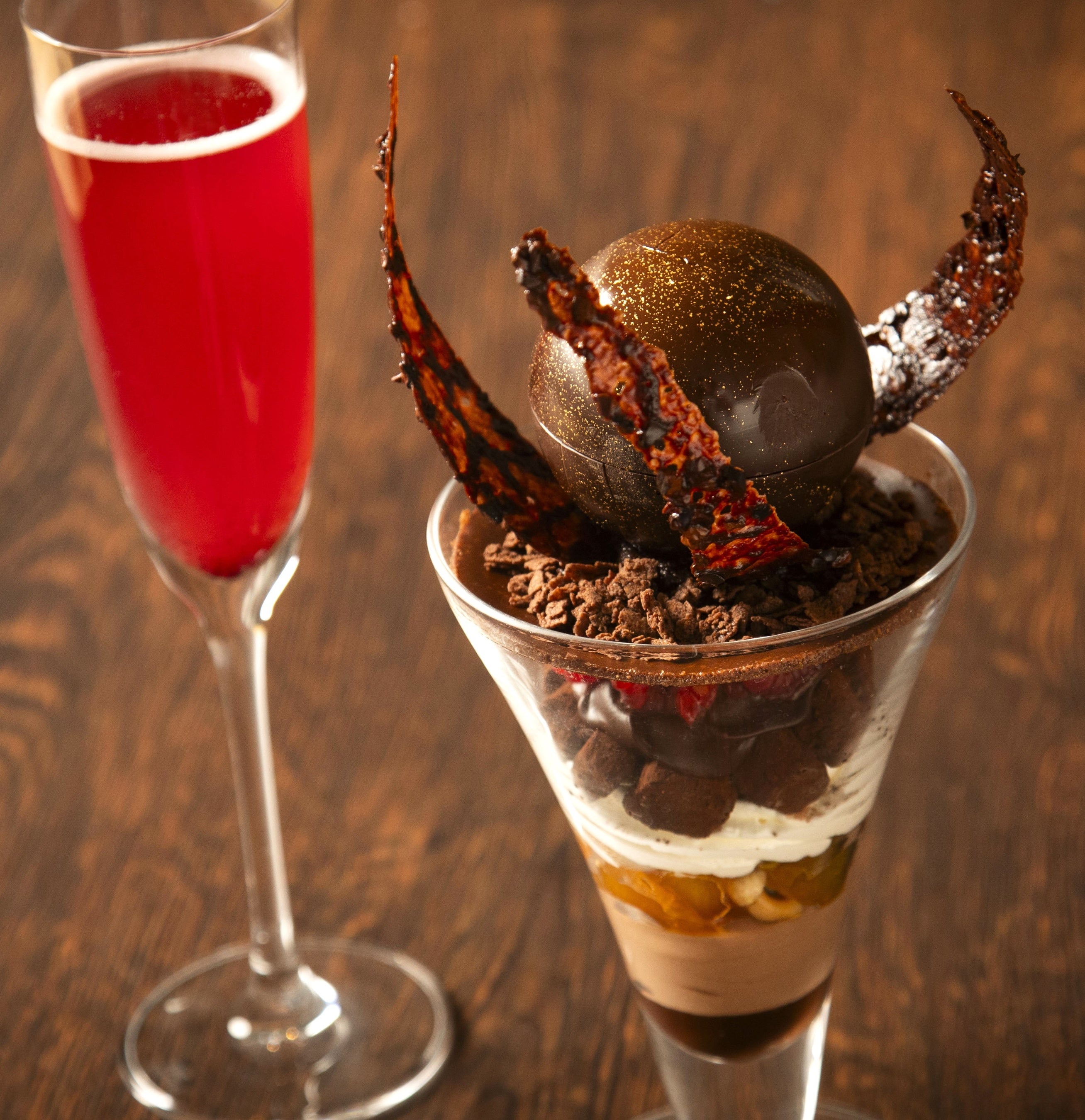 「パフェ ショコラ~五味五感~」は、層ごとに甘味や酸味など様々な味わいが楽しめるとともに、食感や温度の変化にもこだわった体験型パフェ。お酒と一緒にお召しあがりいただくことで、チョコレートの味わいを引き立て、味覚の幅を広げます。