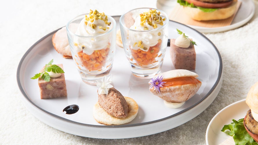 雪だるまの形に仕上げたレアチーズケーキや「クワトロチーズのミニハンバーガー」など、メインの3段プレートとは別添えで提供するメニューもポイントです。