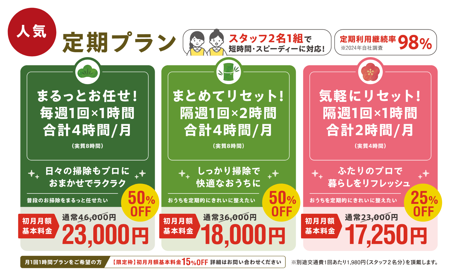 本キャンペーンは、日常的に家事代行サービスを利用してみたい方が気軽に定期利用を始められるよう、初月基本料金を最大50%OFFでご提供するお得な内容です。