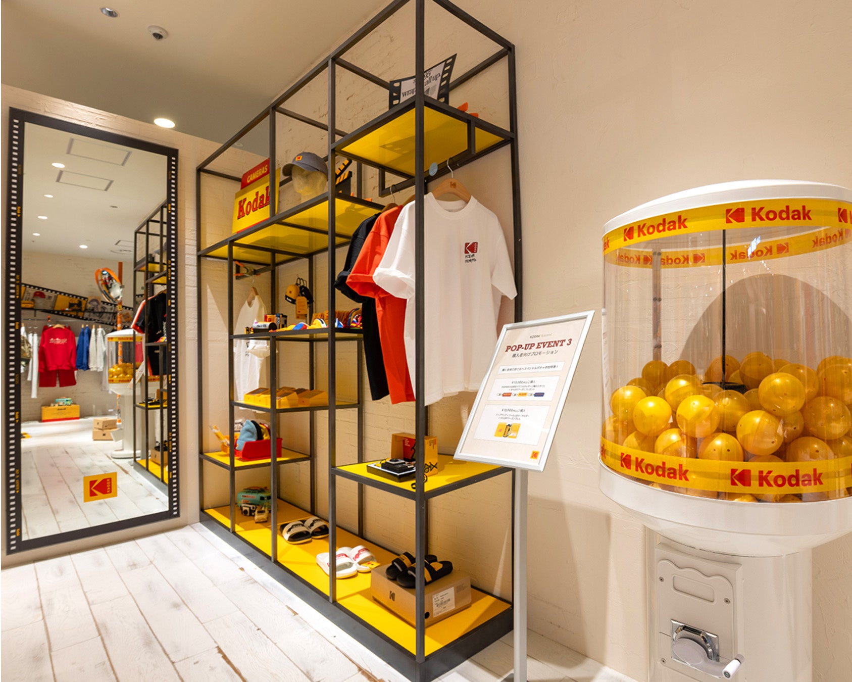 中央には、Kodakの象徴であるフィルムボックスを積み上げたインスタレーションを配置しており、その存在感は圧倒的です。訪れる人々が思わずカメラを構えたくなるようなビジュアルが空間全体に広がります。さらに、フィルムボックスオブジェやカーブミラーなど、店内のどこを切り取っても写真に映える仕掛けが随所に施されています。
