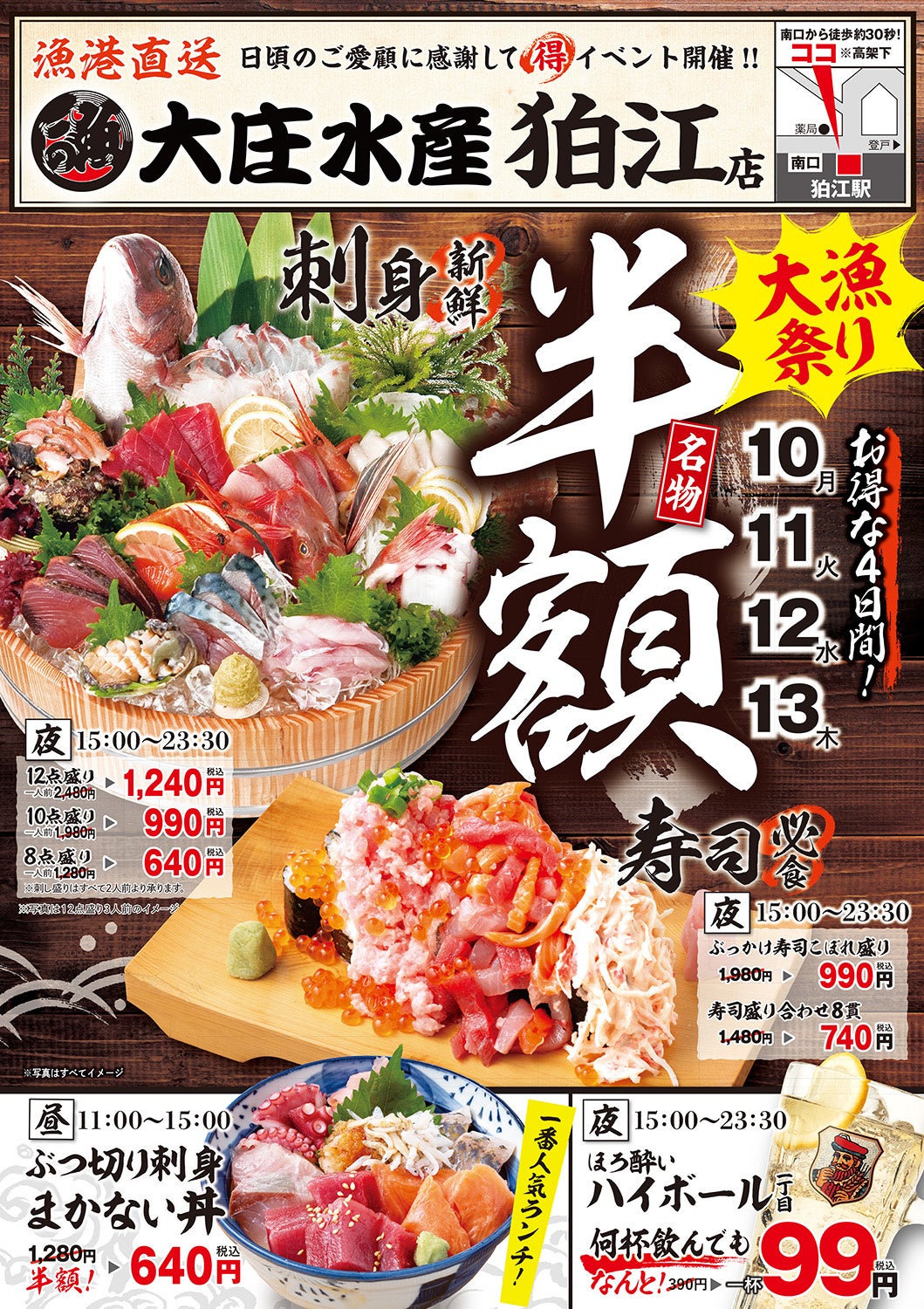 【刺身、寿司、海鮮丼が半額!ハイボールは激安の99円】狛江の『大庄水産』で11/10(月)から11/13(木)の4日間限定