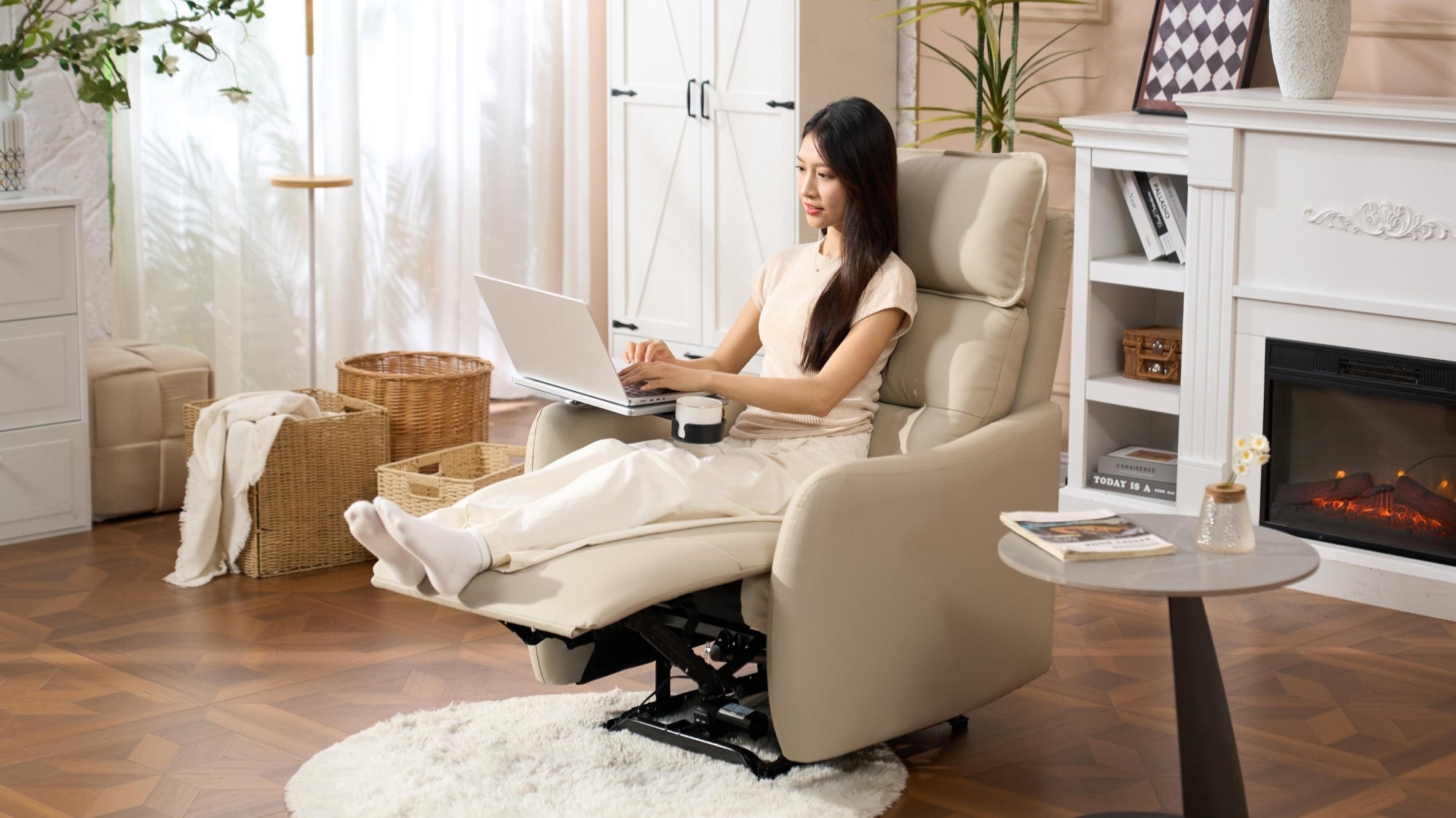 リクライニングソファLune Proデュアルモーターで背もたれとフットレストが独立に調整可能。小型テーブル付きで便利性も高いです。