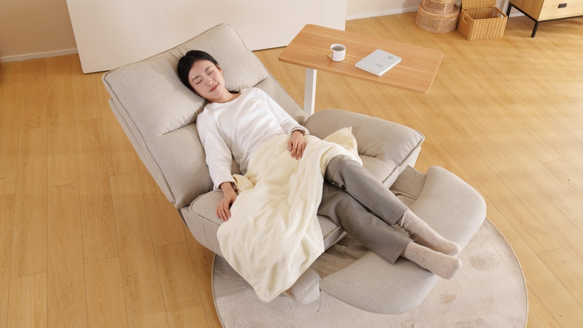 リクライニングソファWaffleふんわりとしたぬくもりあるデザインが特徴。270度回転×前後20度ロッキング機能で、ハンモックのような極上のくつろぎを実現します。