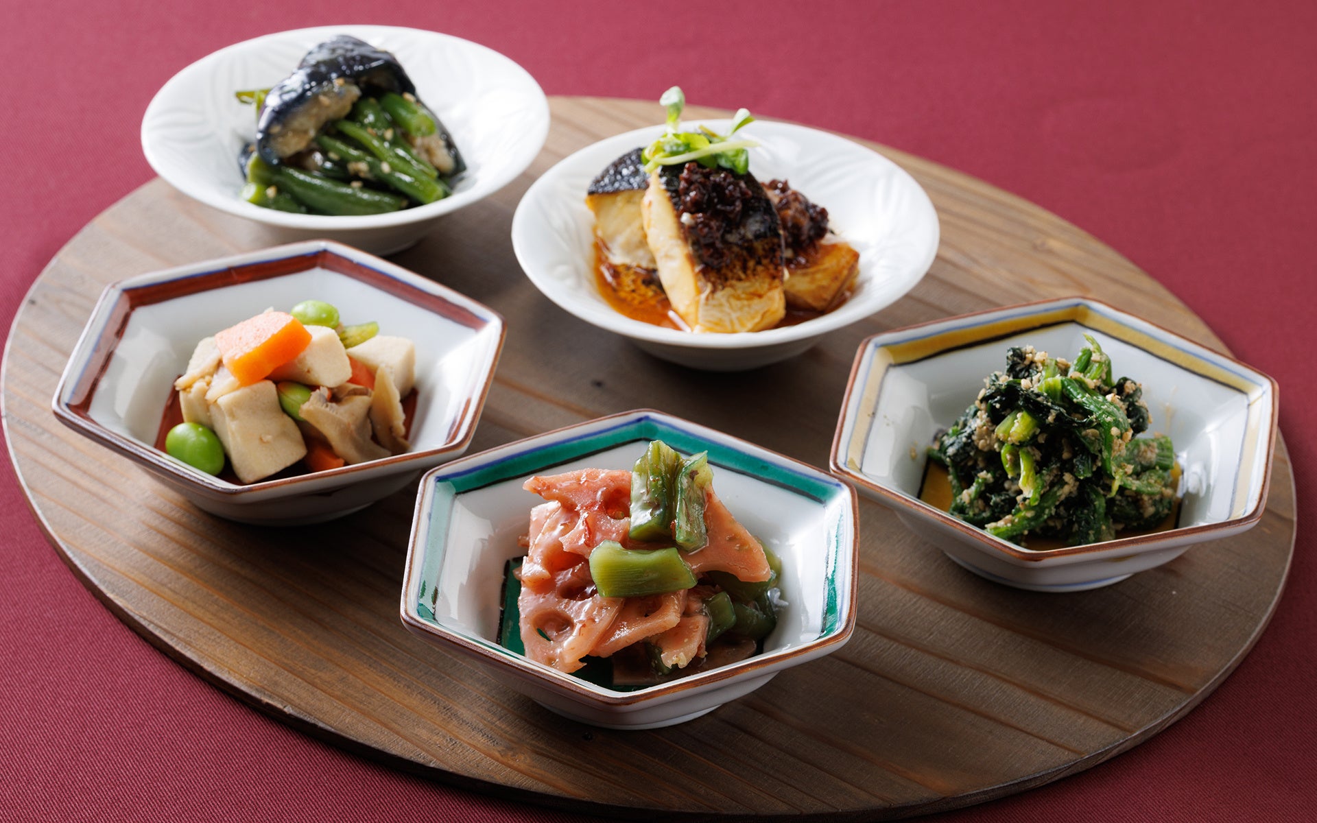 やさしい味わいの煮物や和え物が並び、ほっとするような食卓のぬくもりを感じられる一品です。