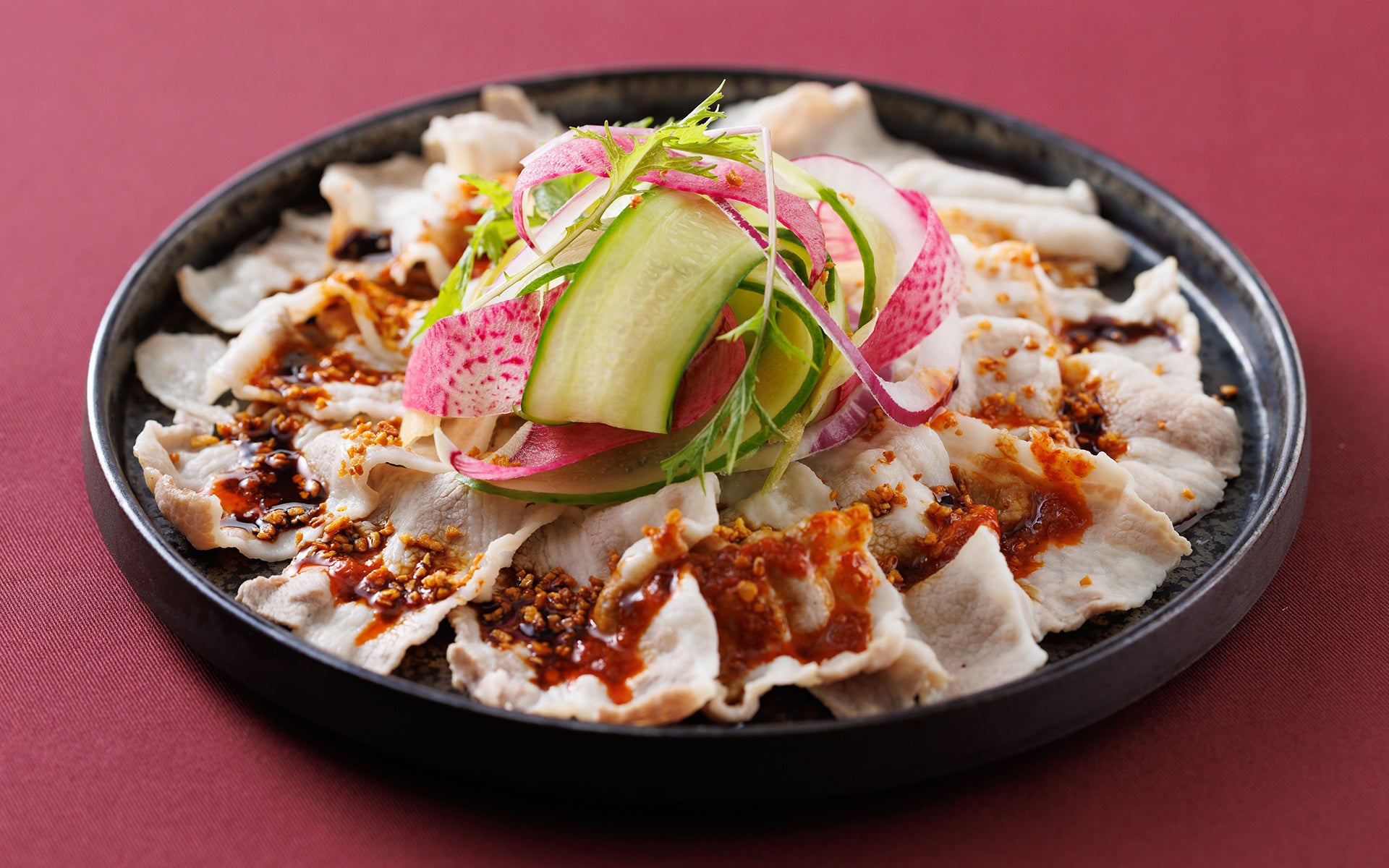ゆでた豚バラ肉を雲に見立てた“雲白肉(ウンパイロウ)”は、香味タレでさっぱりと。