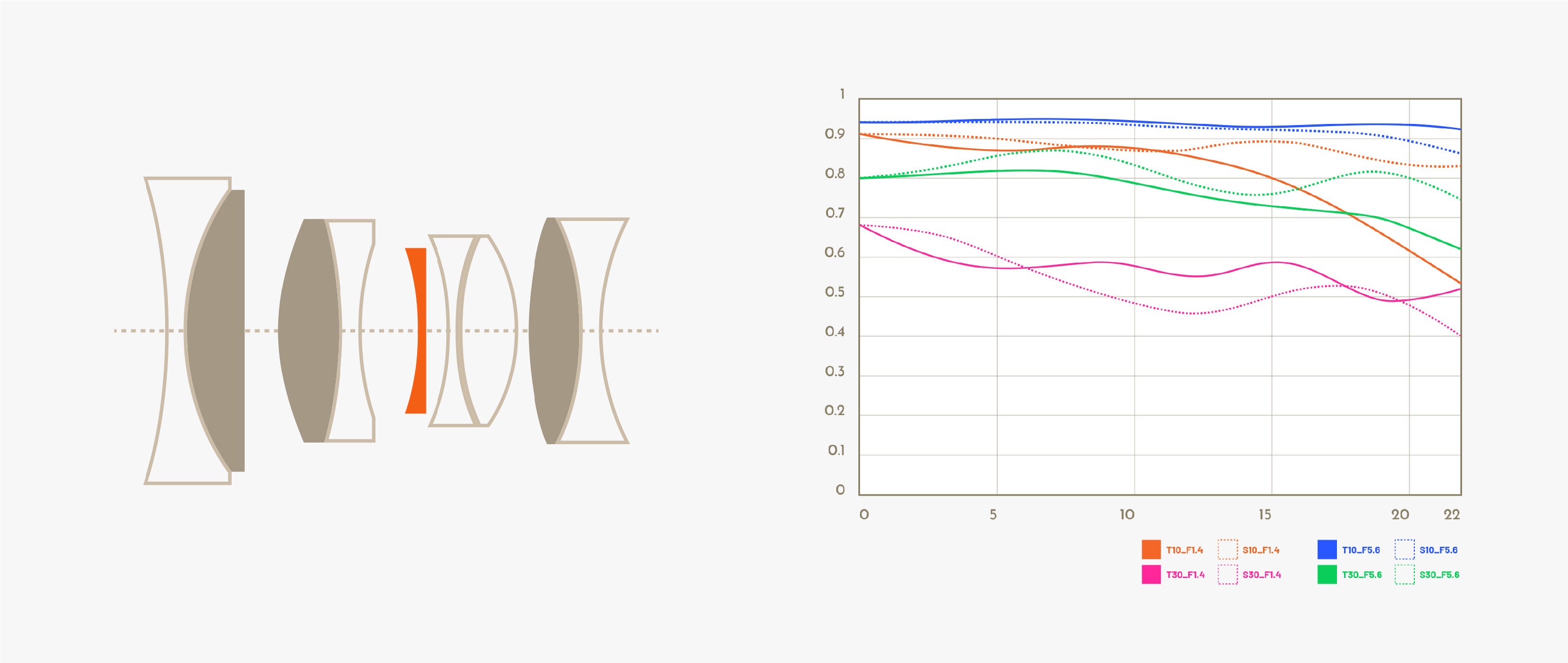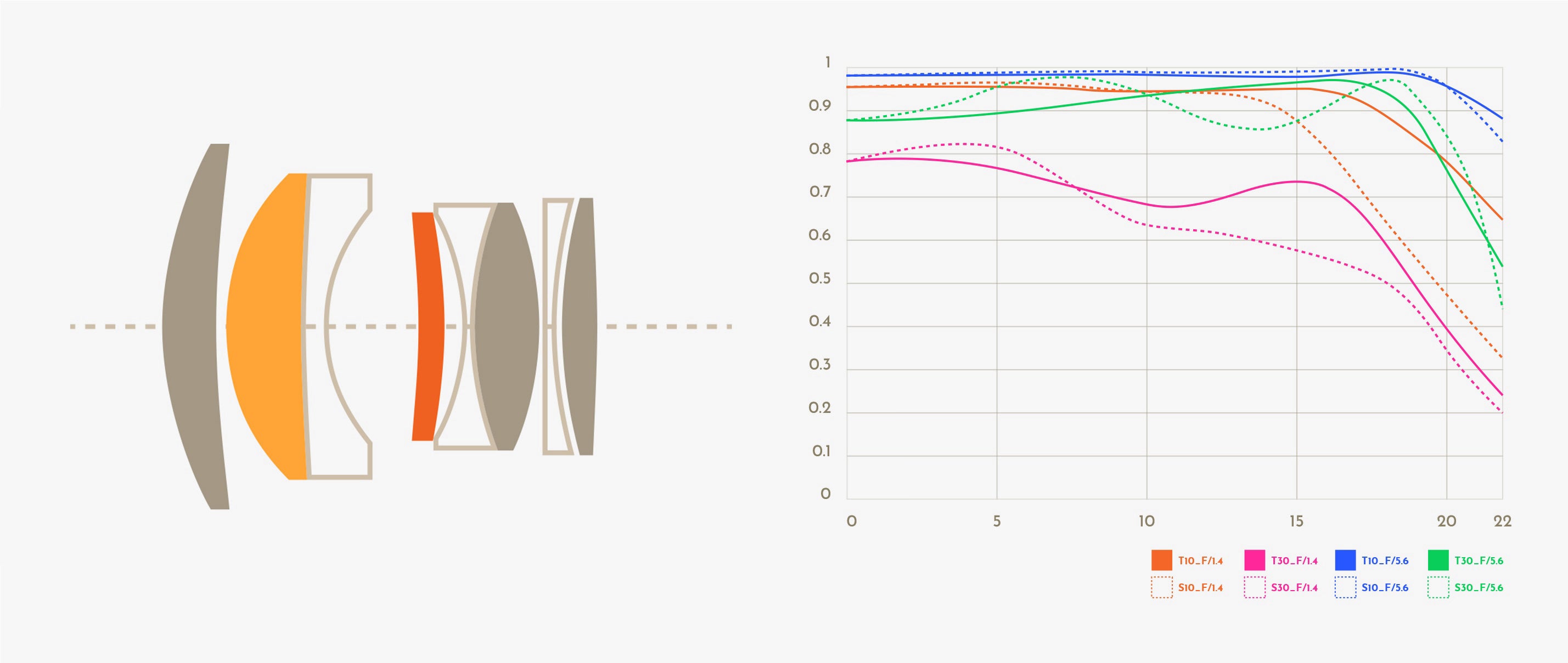 非球面レンズ、高屈折レンズ、EDレンズを組み合わせた高度な光学設計を採用。開放F1.4でも画面の隅々までシャープでクリアな描写を実現し、各種収差を効果的に抑制します。開放F1.4でも画面の隅々までシャープでクリアな描写を実現し、色収差や球面収差を効果的に抑制します。また、14枚の絞り羽根により、柔らかく美しいボケを表現。被写体を際立たせつつ、幻想的な描写を可能にします。