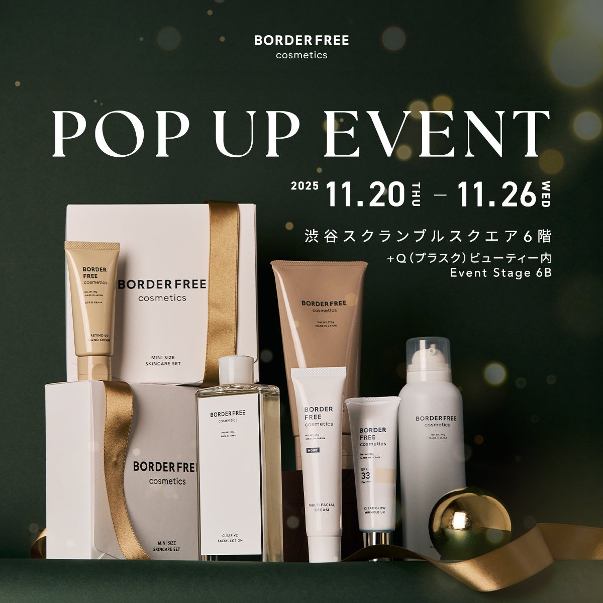MADE IN JAPANのスキンケアブランド「BORDER FREE cosmetics(ボーダーフリーコスメティクス)」は、2025年11月20日(木)~2025年11月26日(水)の期間限定で、渋谷スクランブルスクエア6階にてポップアップストアをオープンします。