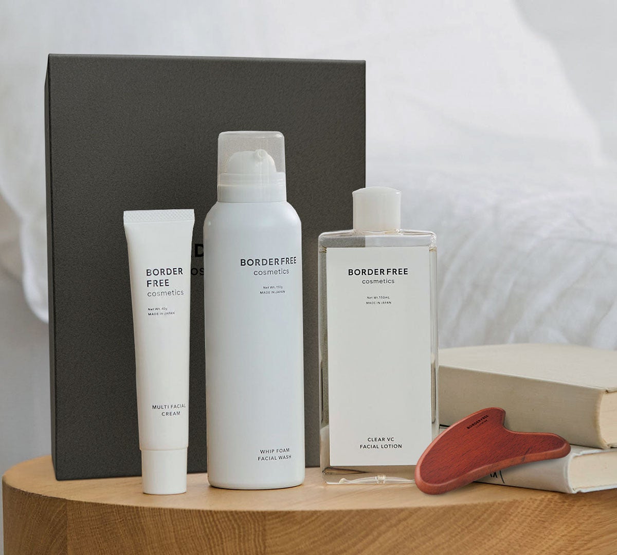 不動の人気を誇る、BORDER FREE cosmeticsのベーシックなスキンケア3点セット(炭酸洗顔※¹・化粧水・クリーム)に、オリジナル木製かっさとGIFT BOXがついた、渋谷スクランブルスクエア限定セット。