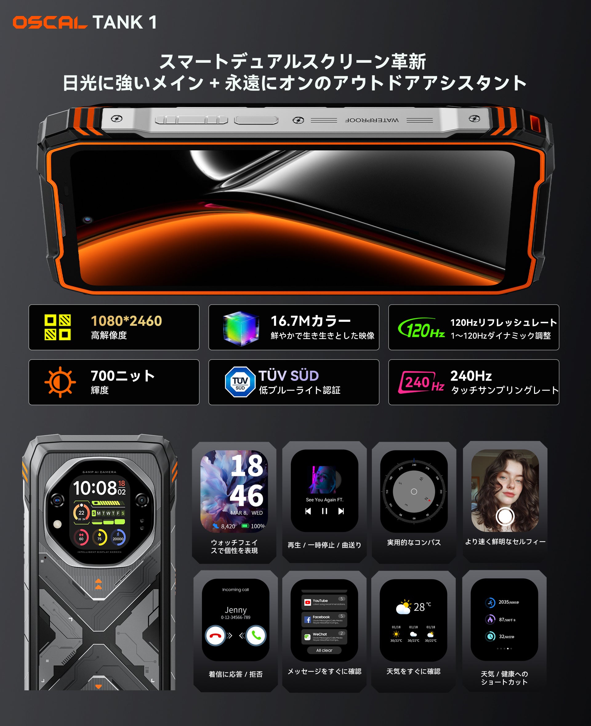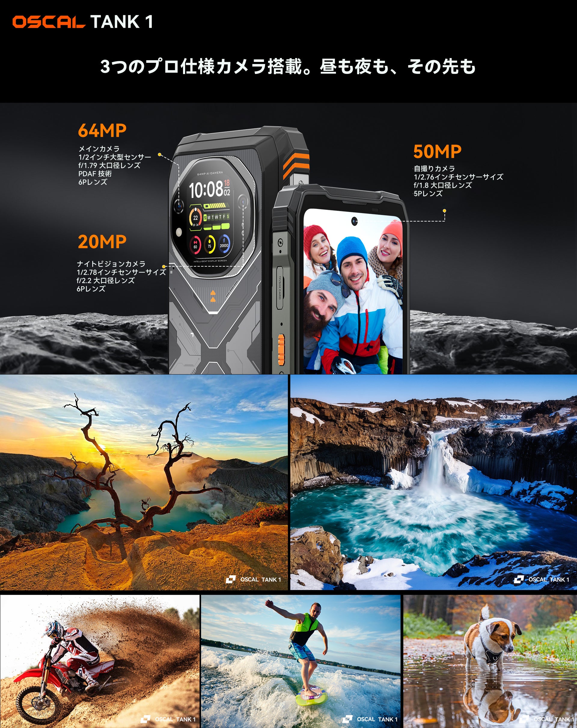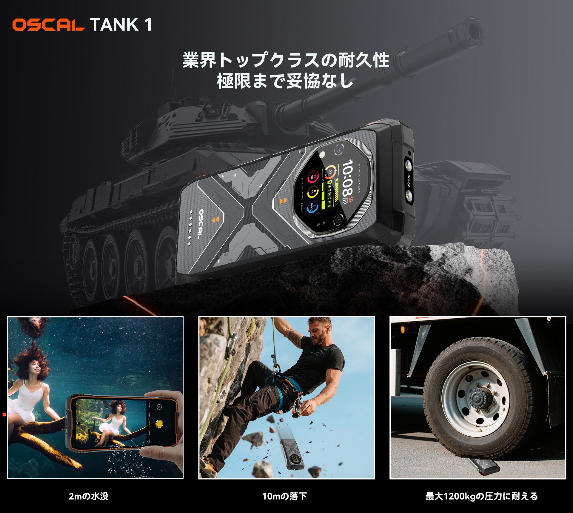 TANK 1は、OSCALのタフネススマートフォンの最上位モデルとして、20,000mAhの大容量バッテリー、6.78インチ2.4Kディスプレイ、170ルーメンデュアルビームLEDライト、64MPメイン+50MPフロント+20MP赤外線ナイトビジョンカメラ、5G対応MediaTek Dimensity 7050、最大48GB RAM、512GBストレージなどを搭載。過酷な環境でも安定したパフォーマンスを発揮し、アウトドアや現場、冒険で活躍するユーザーに最適なスマートフォンです。