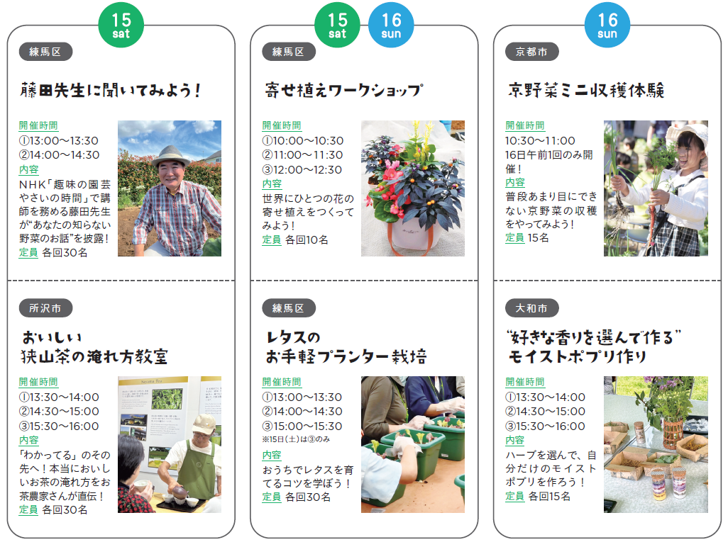 練馬区をはじめ、32自治体の農産物や特産物などが購入できるマルシェのほか、各地の農産物・特産物を使用したメニューを提供するキッチンカーの出店、農業者が講師となるワークショップ、全国の農業者10名とスペシャルゲスト(杉浦太陽さん、宮川大輔さん)を招いたトークライブなど、都市農業の魅力を存分に味わうことができるコンテンツが目白押しです。