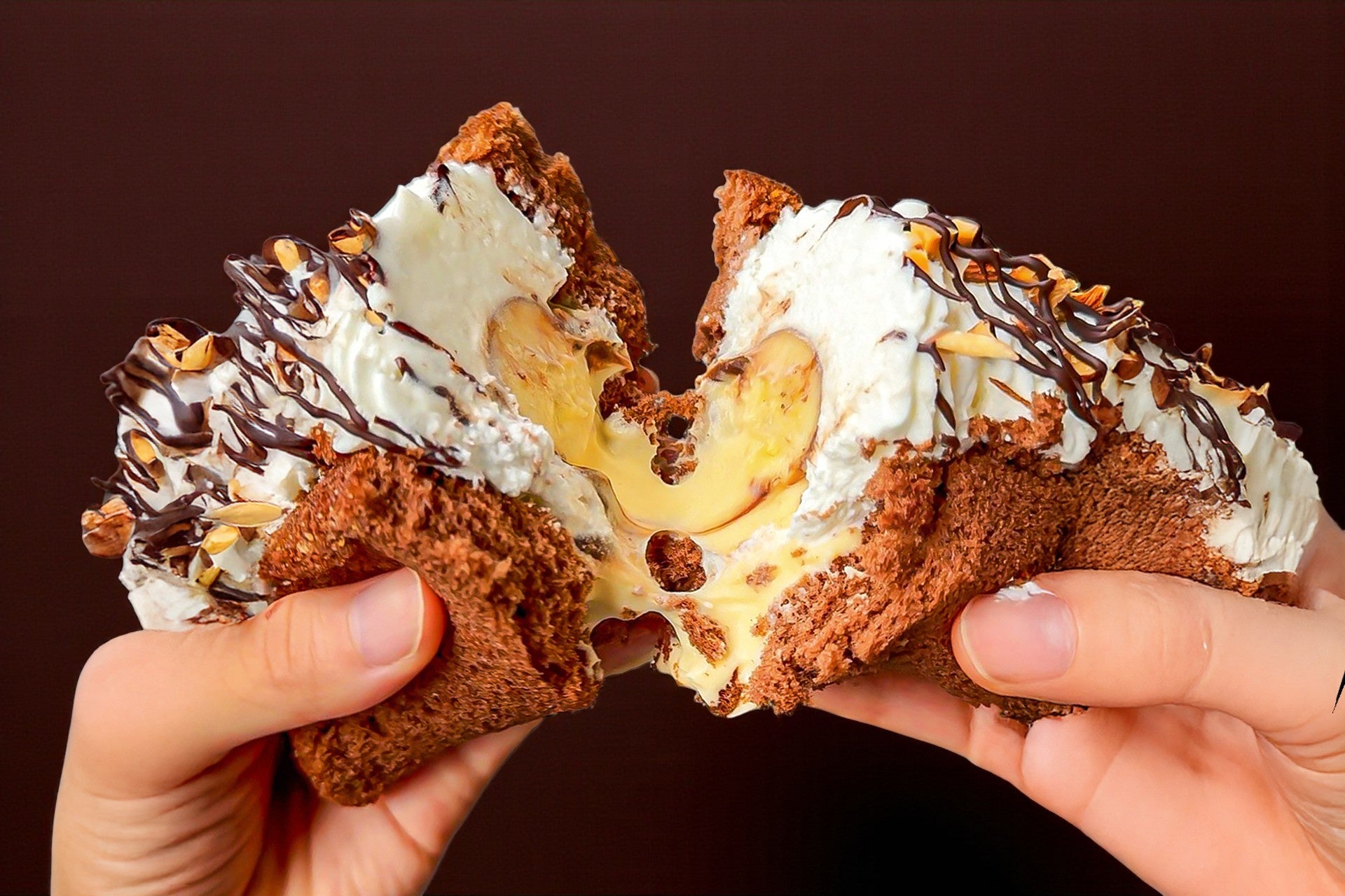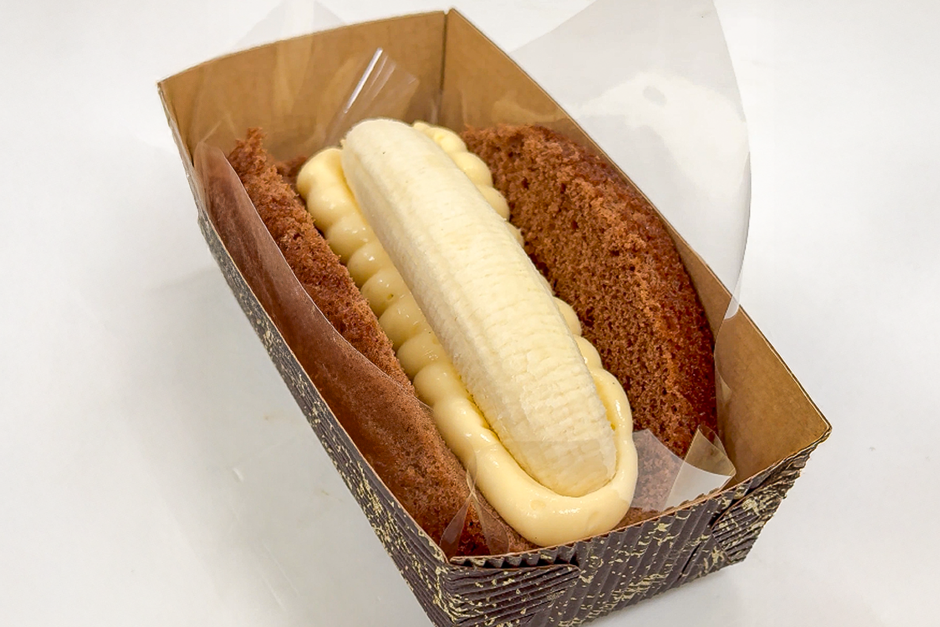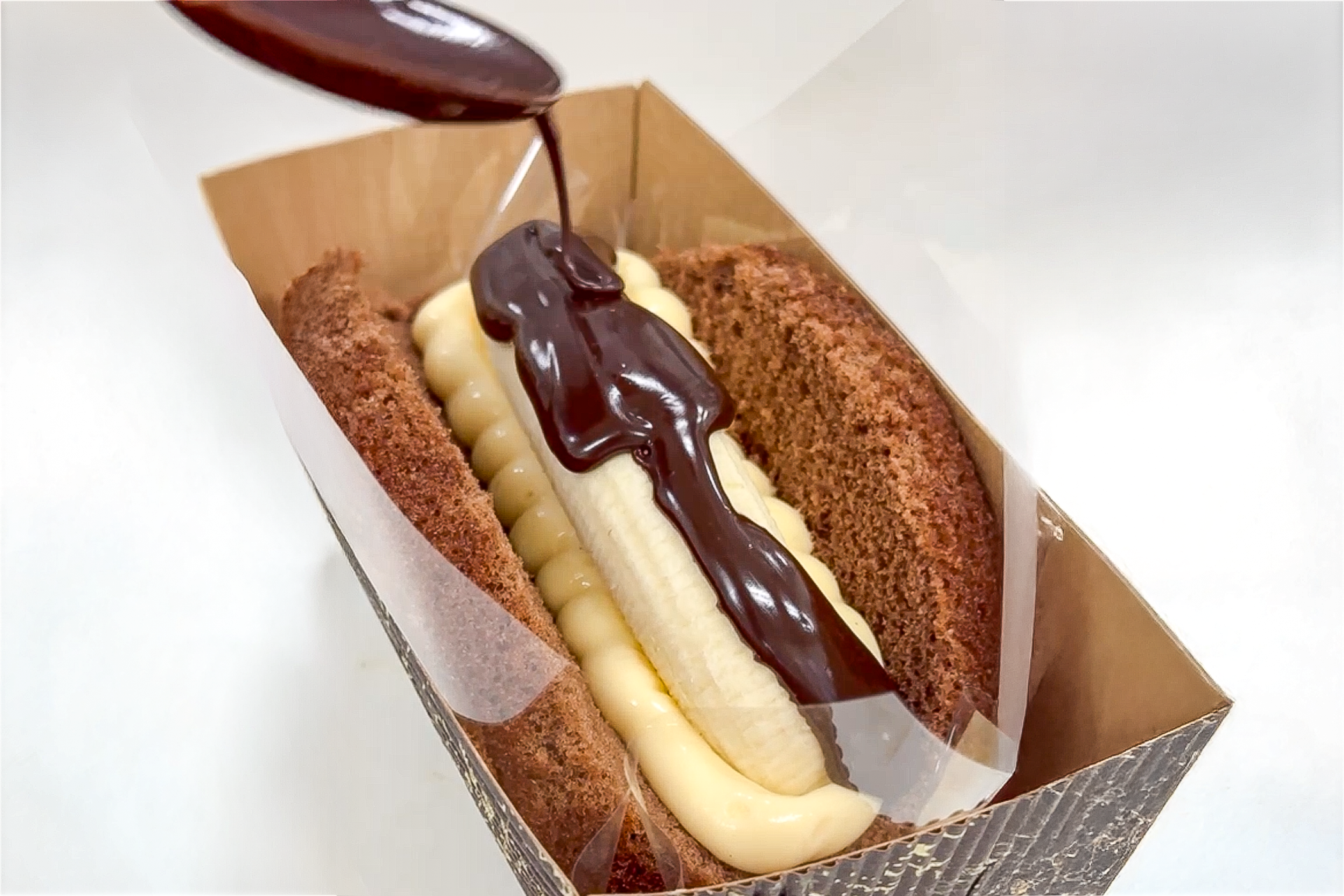 ふんわりチョコスポンジに、なめらかなカスタードをたっぷり。そして中には、完熟バナナをまるごと1本!端から端までぎっしり詰まったバナナが、かぶりついた瞬間に濃厚な甘みを広げる満足感たっぷり仕様。食べごたえも満足感もMAX!やっぱりチョコバナナは、こうでなくっちゃ♪