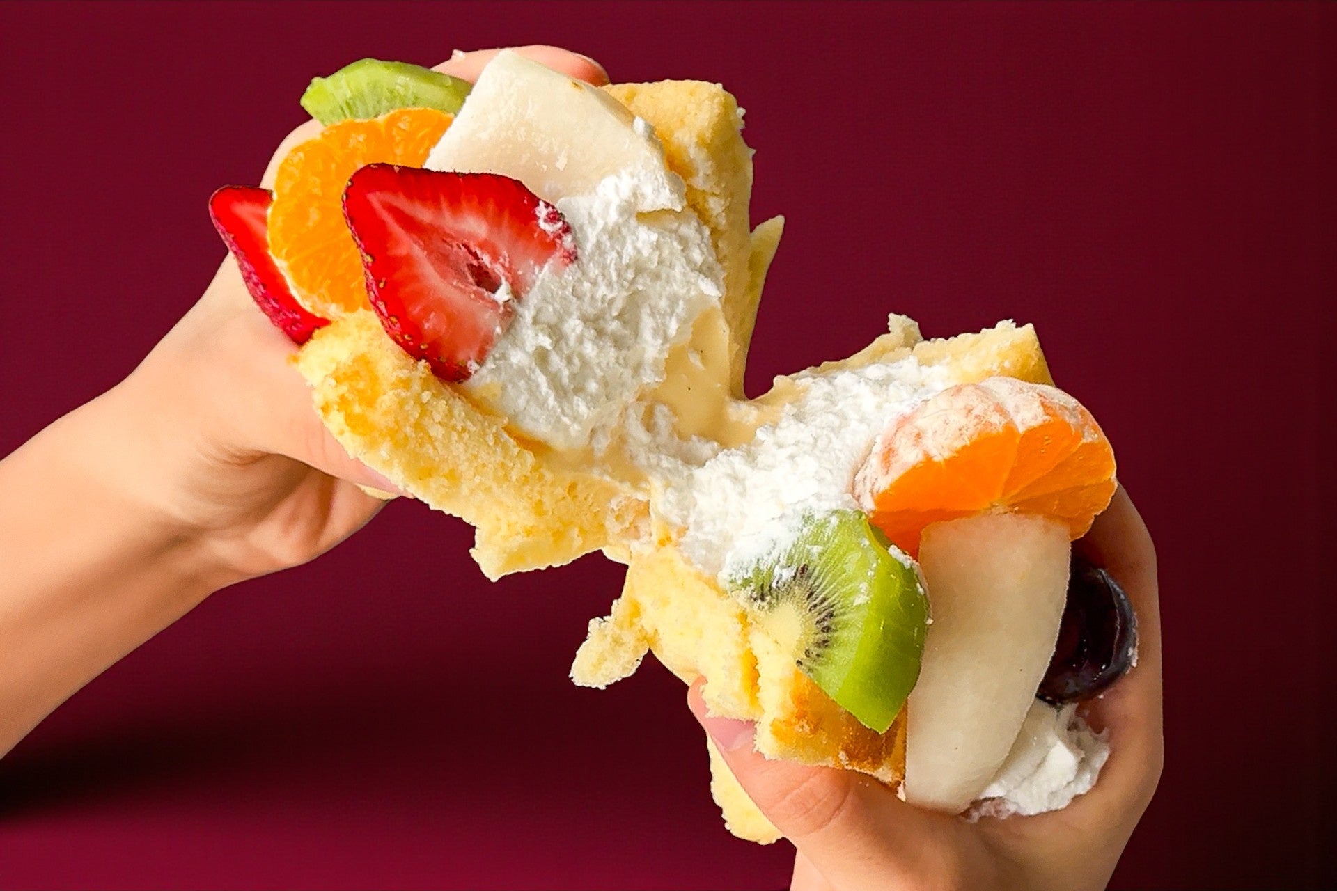 ひと口かじれば、ふわふわのスポンジに唇が沈み、盛りすぎたクリームとフルーツの雪崩が一気に押し寄せる!もう顔じゅうスイーツまみれ!――でも、それさえも幸せな贅沢感♪