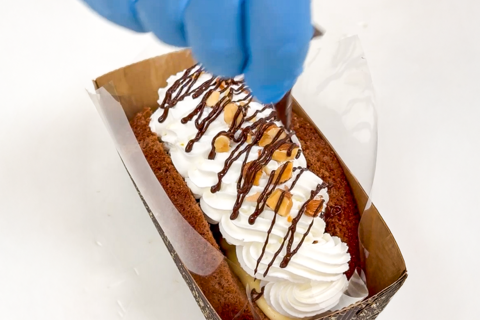 バナナの上に重ねたのは、当店特製の濃厚チョコレートガナッシュ。このガナッシュこそ、味の決め手。ひんやり冷やされたオムレットの中で、ガナッシュがまるで生チョコのようにとろけ、濃厚バナナと溶け合う瞬間はまさに“チョコバナナの極致”。