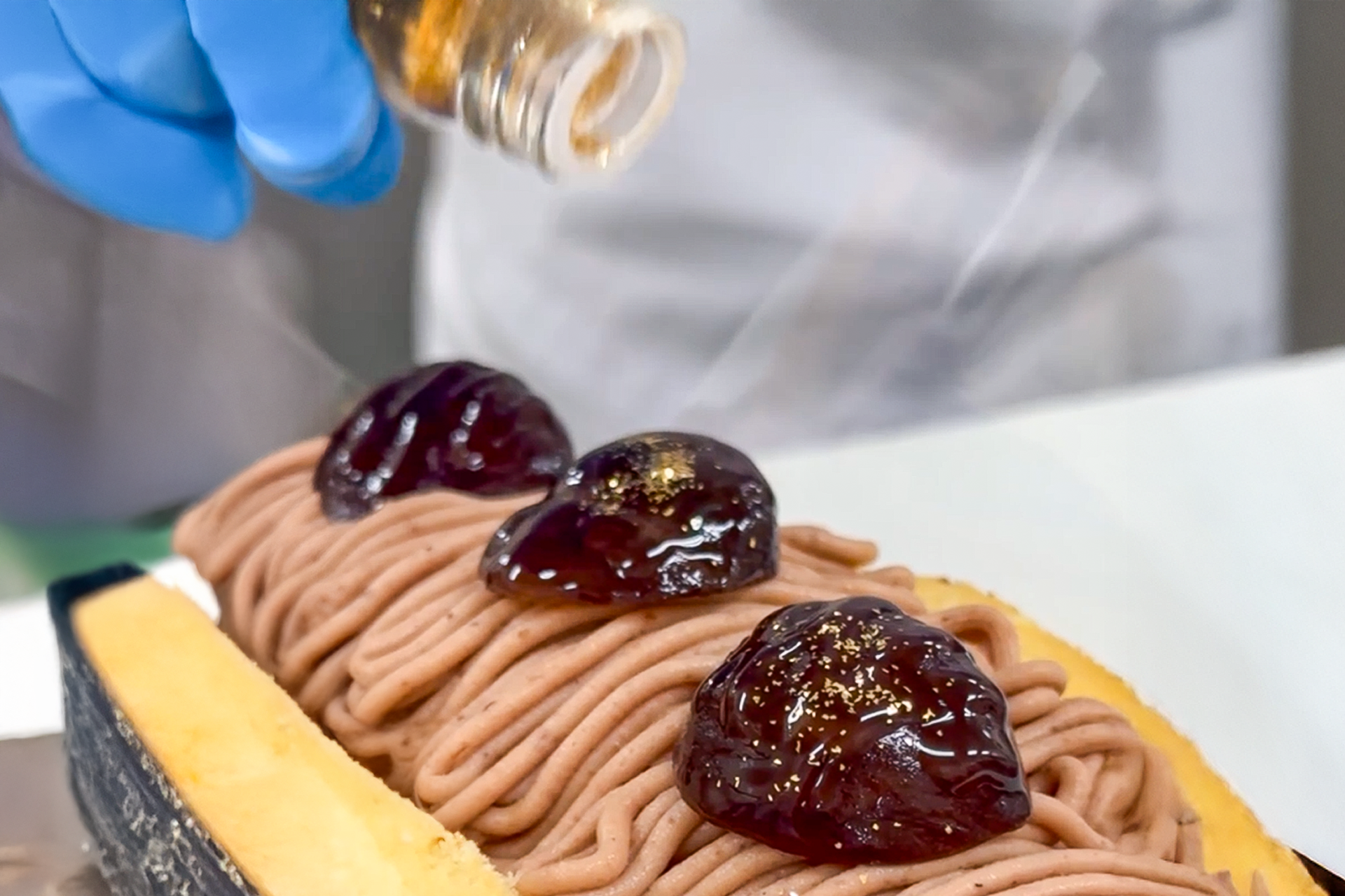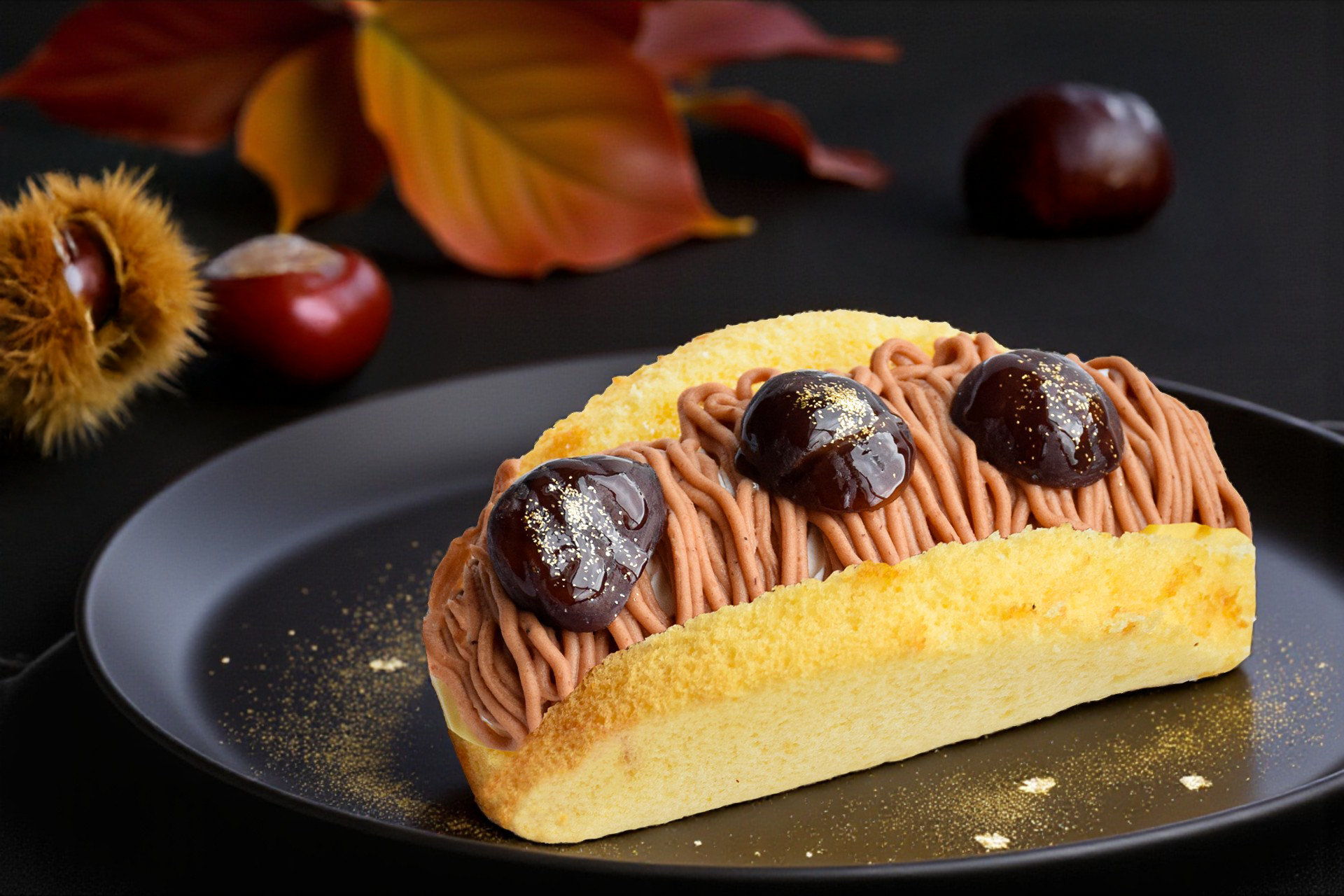 大ぶりの渋皮栗を贅沢に3粒トッピングし、光沢のナパージュで艶やかにコーティング。仕上げに煌めく金箔を散らせば、贅沢感あふれる華やかオムレットの完成です。