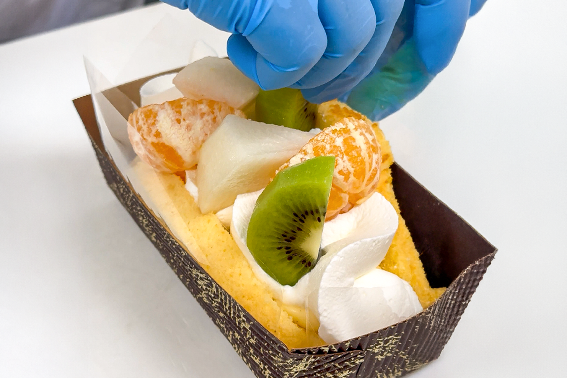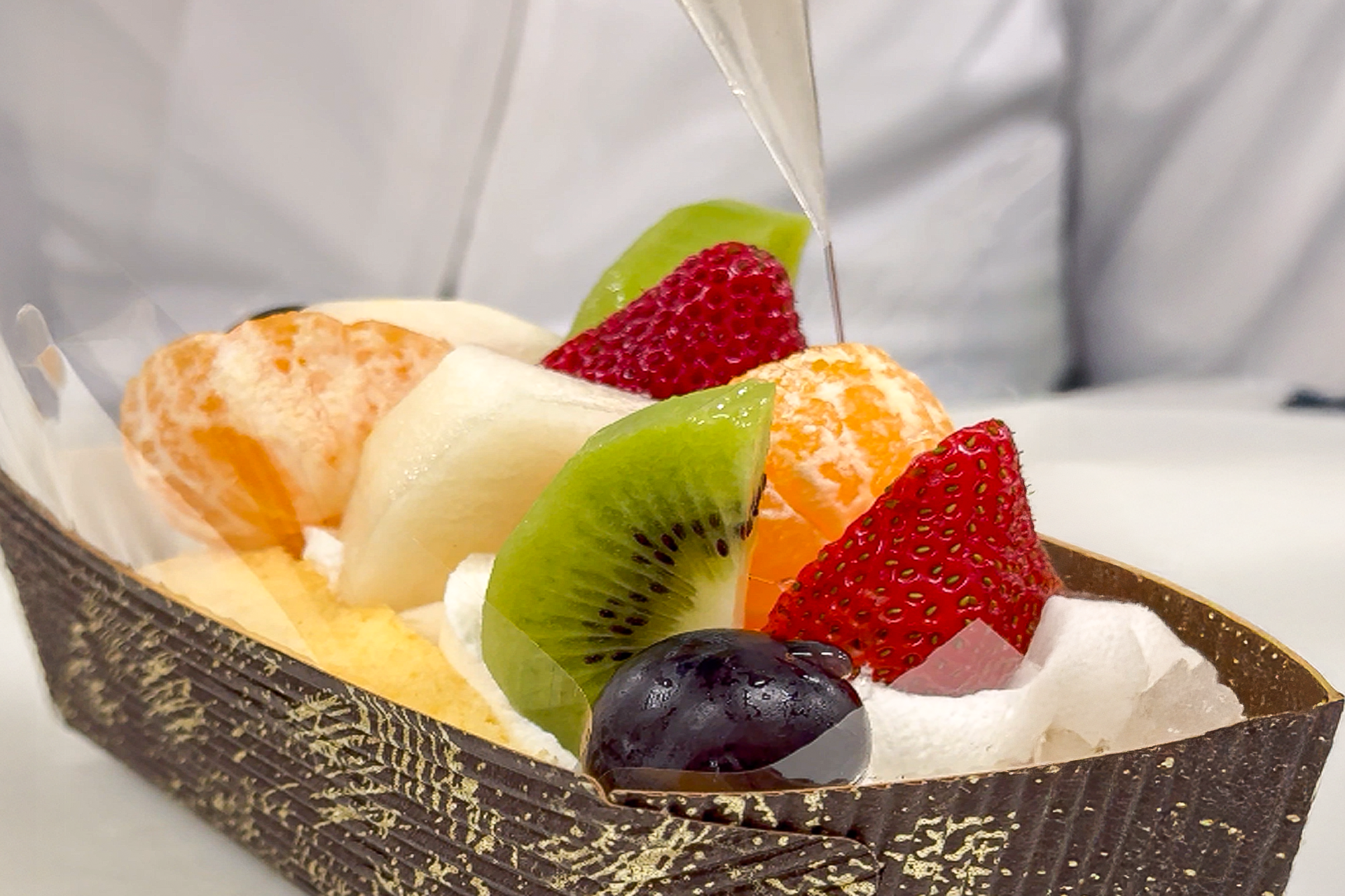 プレーンのオムレットには、たっぷりのカスタードの上に、ふわっと波打つように絞った「ウェーブ絞り」の生クリーム。見た目の美しさはもちろん、上に重なるフルーツをやさしく受け止める絶妙なバランス。軽やかにとろける口どけと、職人の美意識が宿る“一筆のような”仕上がりです。