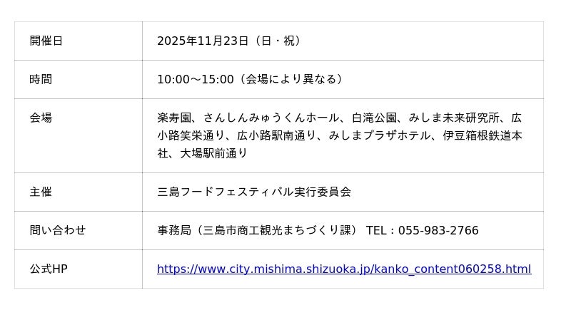 【静岡県三島市】“三島のおいしい”が街中に大集合!「三島フードフェスティバル2025」、11月23日(日・祝)開催