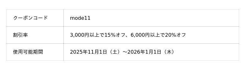 東京モード学園とのコラボを記念し、スペシャルクーポンを配布いたします。2025年11月1日(土)から2026年1月1日(木)までの期間、クーポンコード「mode11」を入力し、SHEINでお買い物いただくと最大20%オフになり、お得にお買い物が楽しめます。