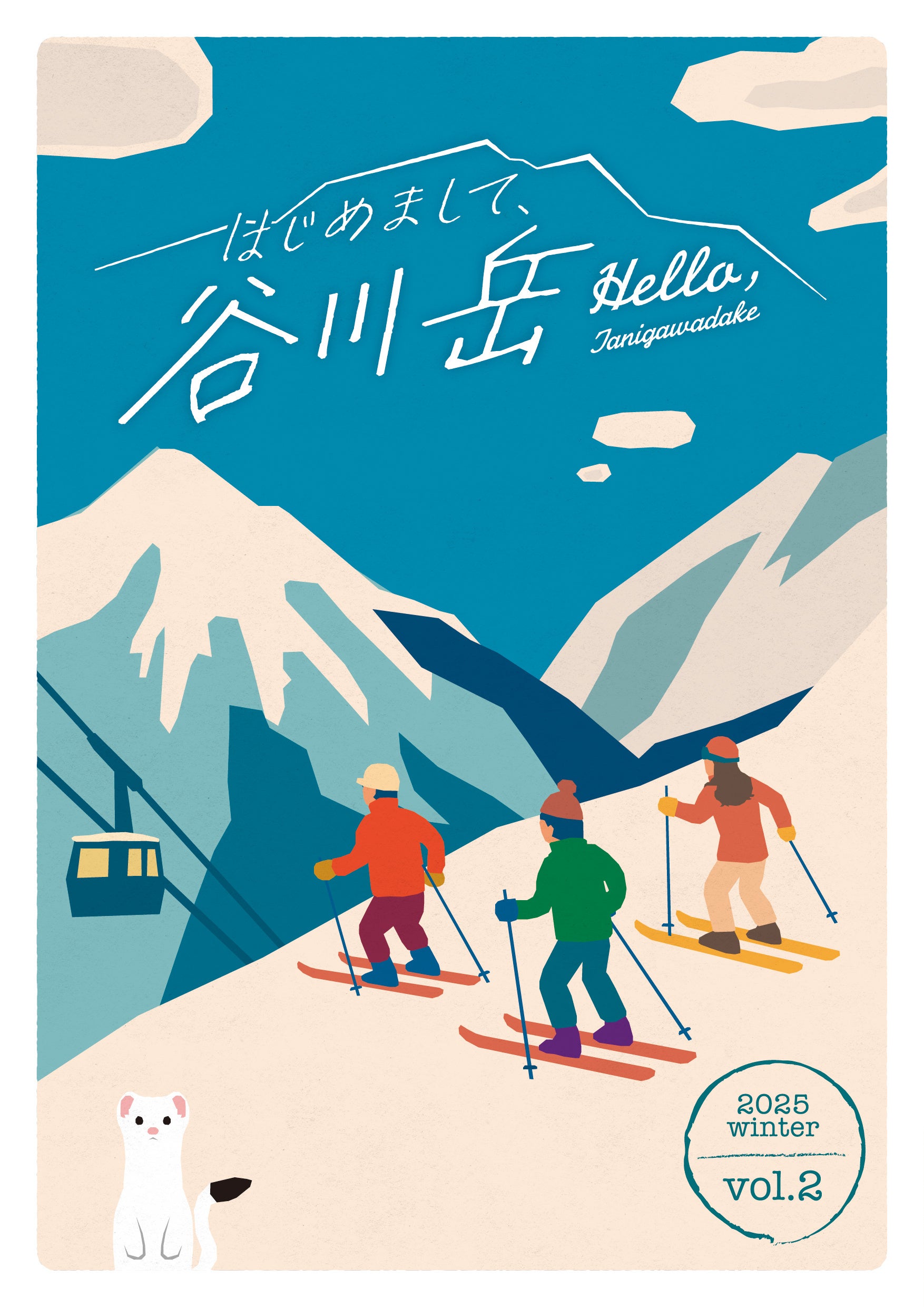 谷川岳の冬を連想させる表紙デザイン。スキーや冬毛のオコジョも。