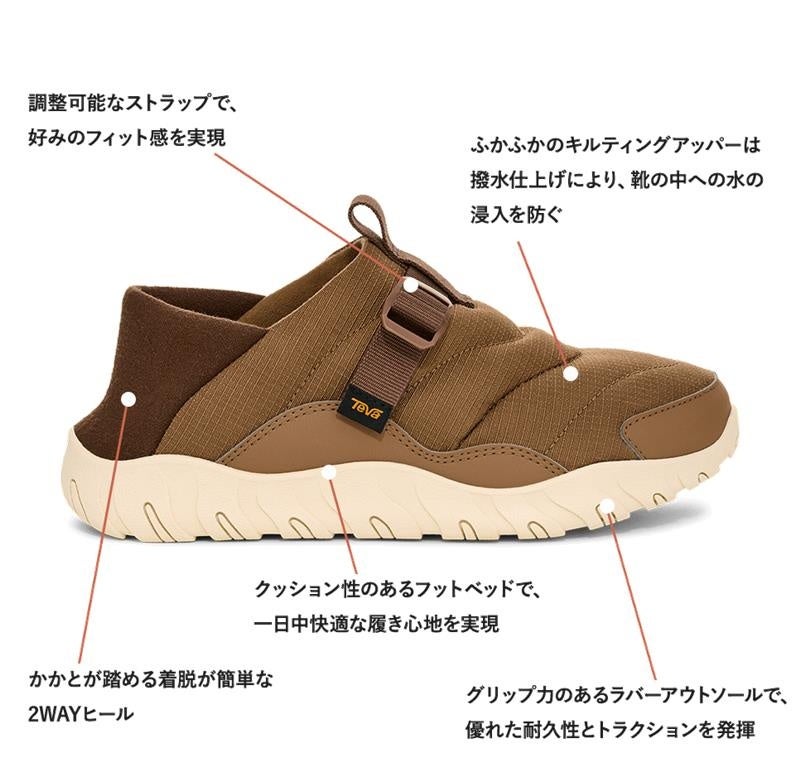 寒い季節に最適な ReEmber Campは、ふっくらとしたキルティングのアッパーで雲のような快適さを提供します。一日中履いても十分なサポート力を備えたこの多用途のキャンプシューズは、滑りにくいラバーソール、アッパーをホールドする調節可能なストラップ、インナーテントでも簡単に着脱できるかかとが踏める2WAYヒールを採用しています。
