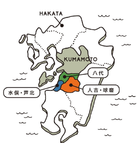 人吉市と球磨郡9町村からなるエリア。宮崎県と鹿児島県に隣接、山深い九州中央山地に囲まれた盆地。くまもと県南エリアの主な特産品