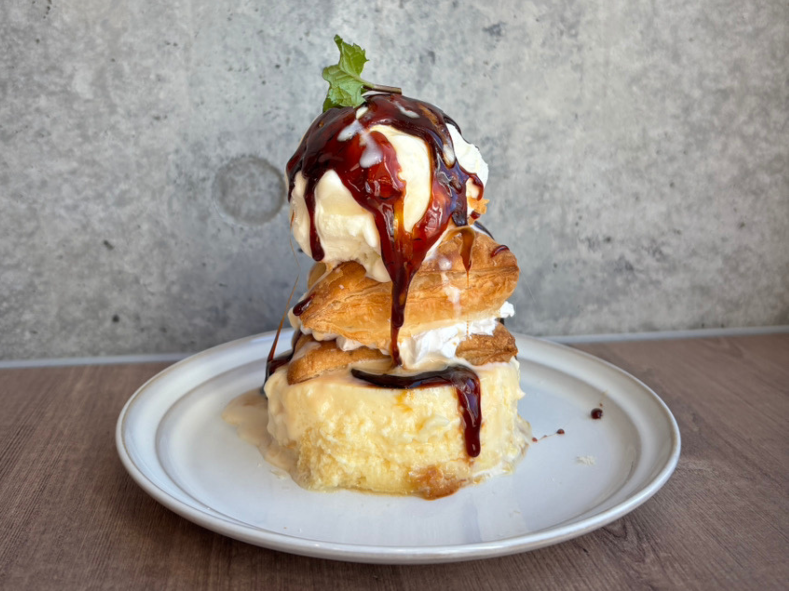 これは、もはやデザートを超えた、物理法則の限界に挑戦する「建築物」そのもの。土台の超高密度プリンが「アイソレーター」として機能し、その上に積み上げられたパイとクリーム、アイスが織りなす超高層タワーを支えます。