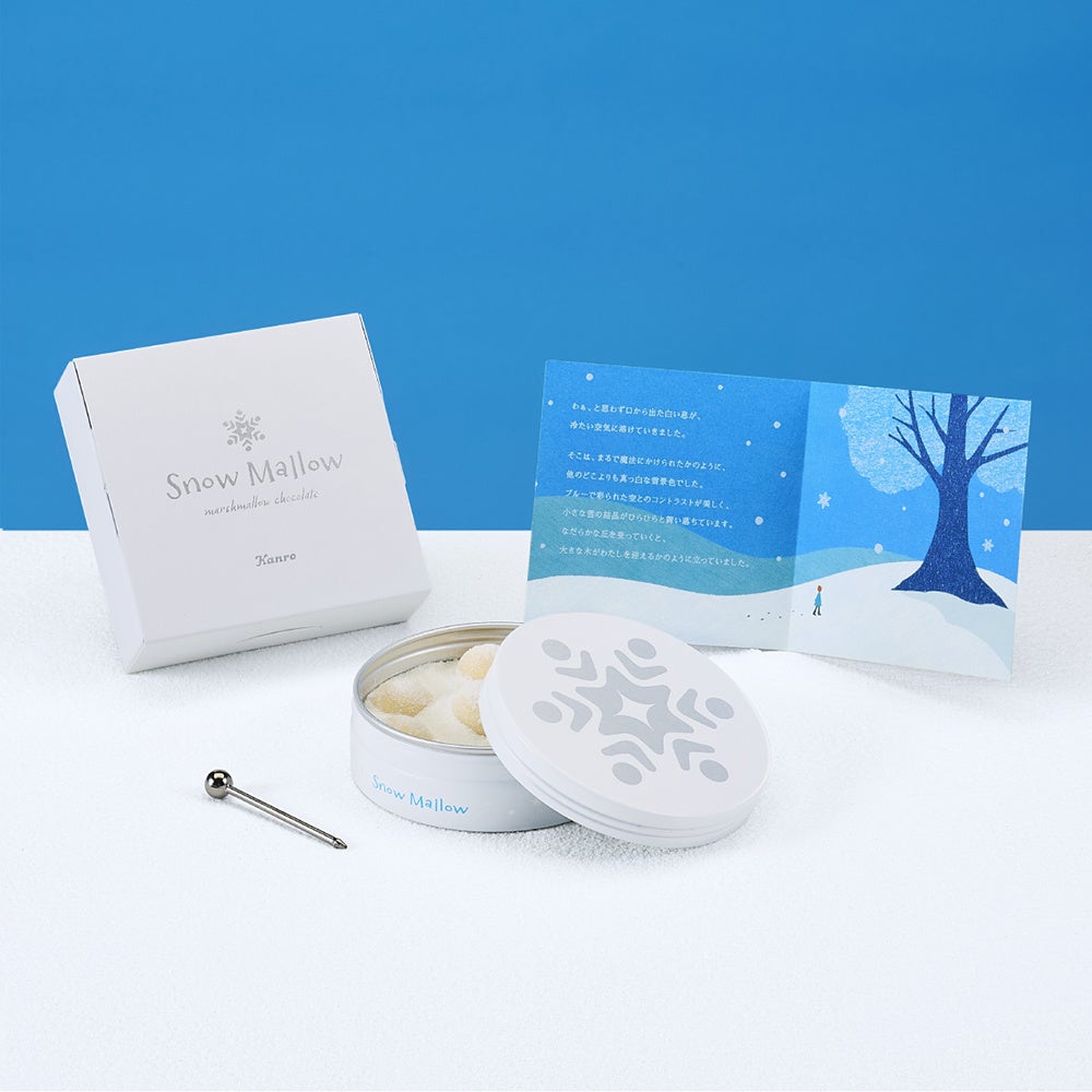 アメージングカンロの第3弾として今回発売する「スノーマロウ(snow mallow)」は、ショコラの雪に隠れた、もっちりマシュマロをコンセプトにした雪の世界観を詰め込んだこれからの季節にぴったりな冬季限定商品です。爽快パウダーをまとったマシュマロにホワイトショコラをたっぷりとコーティングした雪玉のような粒を、まるで雪のようなくちどけの粉雪ショコラでたっぷりと覆うようにスノーマロウ缶に入れてお届け。付属のシルバーピックで粉雪ショコラの中に隠れている雪玉を探す「雪玉さがし」や粉雪ショコラをスプーンですくう「スコップすくい」など、まるで雪遊びしているような世界観でお楽しみいただけます。同梱のリーフレットにはショートストーリー「A story of Snow Mallow」が描かれており、スノーマロウの世界観にたっぷり没入できる商品になっています。ティータイムや週末の贅沢など自分へのご褒美にはもちろん、友人や同僚などへの冬のプチギフトなど様々なシーンでお楽しみいただけます。