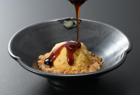 『焼き蜜芋(安納芋)のキャラメリゼ~バニラあいす添え~』税込920円 濃厚な甘みとしっとりなめらかな食感が特長の蜜芋(安納芋)を丁寧に焼き上げました。皮をむき、丸ごと食べられるように仕上げた焼き芋の表面を香ばしくキャラメリゼし、香り立つ焦がしの風味をまとわせた一品です。添えられた冷たいバニラアイスの濃厚な甘さが、温かい蜜芋と溶け合い、至福のひとときをお楽しみいただけます。